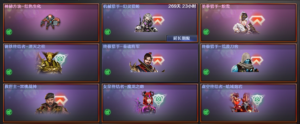 【圣拳猎手炽雪,荒漠刀客秦魂将军,机械猎手幻灵猎姬,终极猎手荒漠刀客,虚空终结者暗域熔岩,钢铁终结者湮灭之柱,女皇终结者魔龙之吻,救世主黑桃战神】