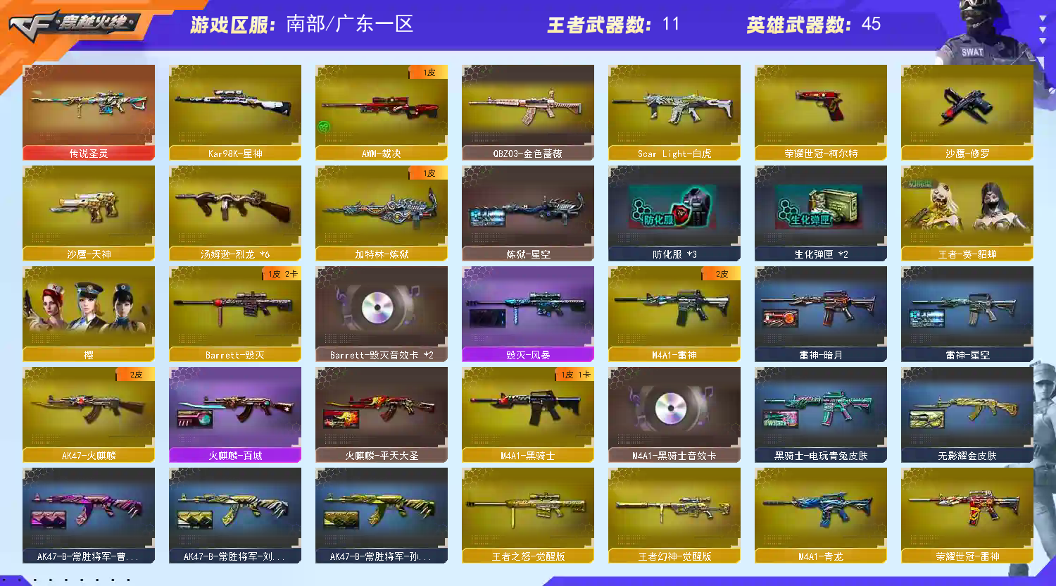【主武器】火麒麟 雷神 黑骑士 无影 黑武士 青龙 白虎 QBZ03-金色蔷薇 猎神 战士 战神 荣耀世冠-雷神 身先士卒 常胜将军 天龙*2 毁灭 裁决 Barreet-金色蔷薇*2 传说圣灵 王者之怒 暗月传说 王者幻神 炼狱 烈龙*6 M4A1-英雄-能量核心 黑骑士摸金校尉 魂QBZ03-金色蔷薇-萌杀 魂黑骑士现代金属*2 魂黑鲨青花瓷 魂火麒麟百城 魂雷神宇航兔兔 魂龙血锋芒破茧 御黑龙龙太子 御黑骑士白马银枪 御黑武士烈虎 御雷神葫芦兄弟 御雷神机甲刑天 御雷神烈虎*2 御千变孔明 御麒麟18 源机械迷城 源千变 源无影 炫金千变 炫金武士 魂裁决新人王绿豆 魂毁灭青帝 魂毁灭神秘黑洞 天龙曼陀罗 御毁灭黑大圣 御毁灭葫芦兄弟 源裁决 源极光 魂炼狱玩具枪 御炼狱女娲 神圣爆裂者III 神圣爆裂者-末日III 征服者超越3 死亡之眼
