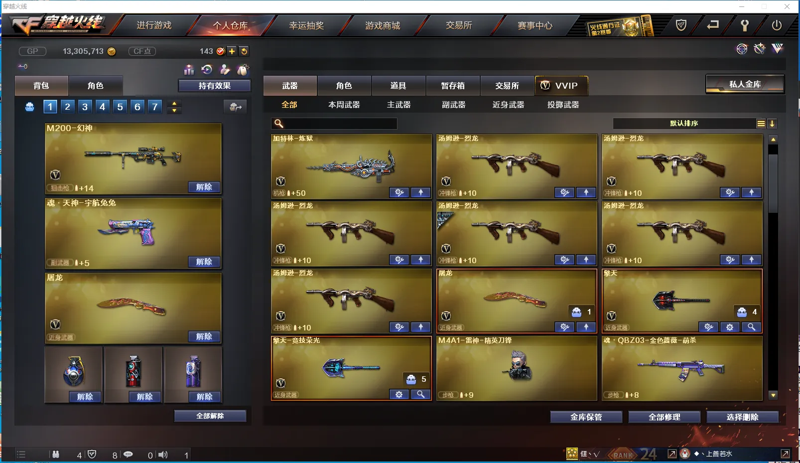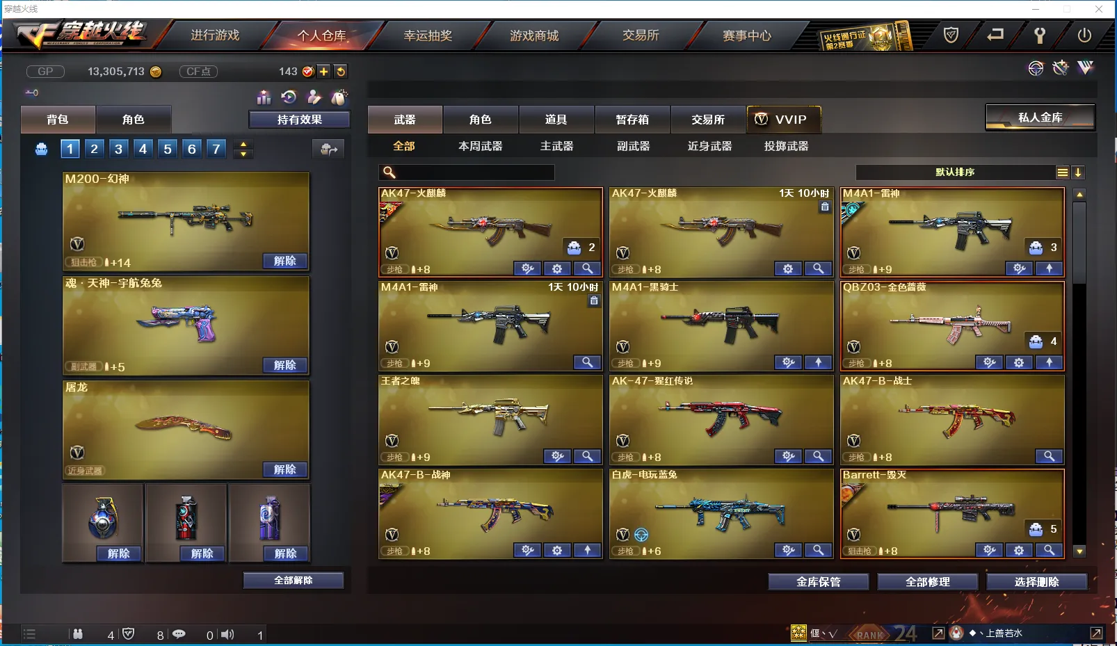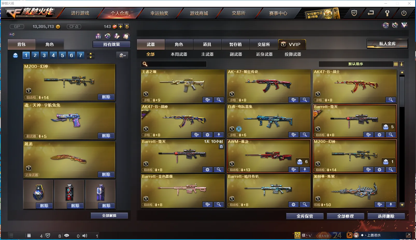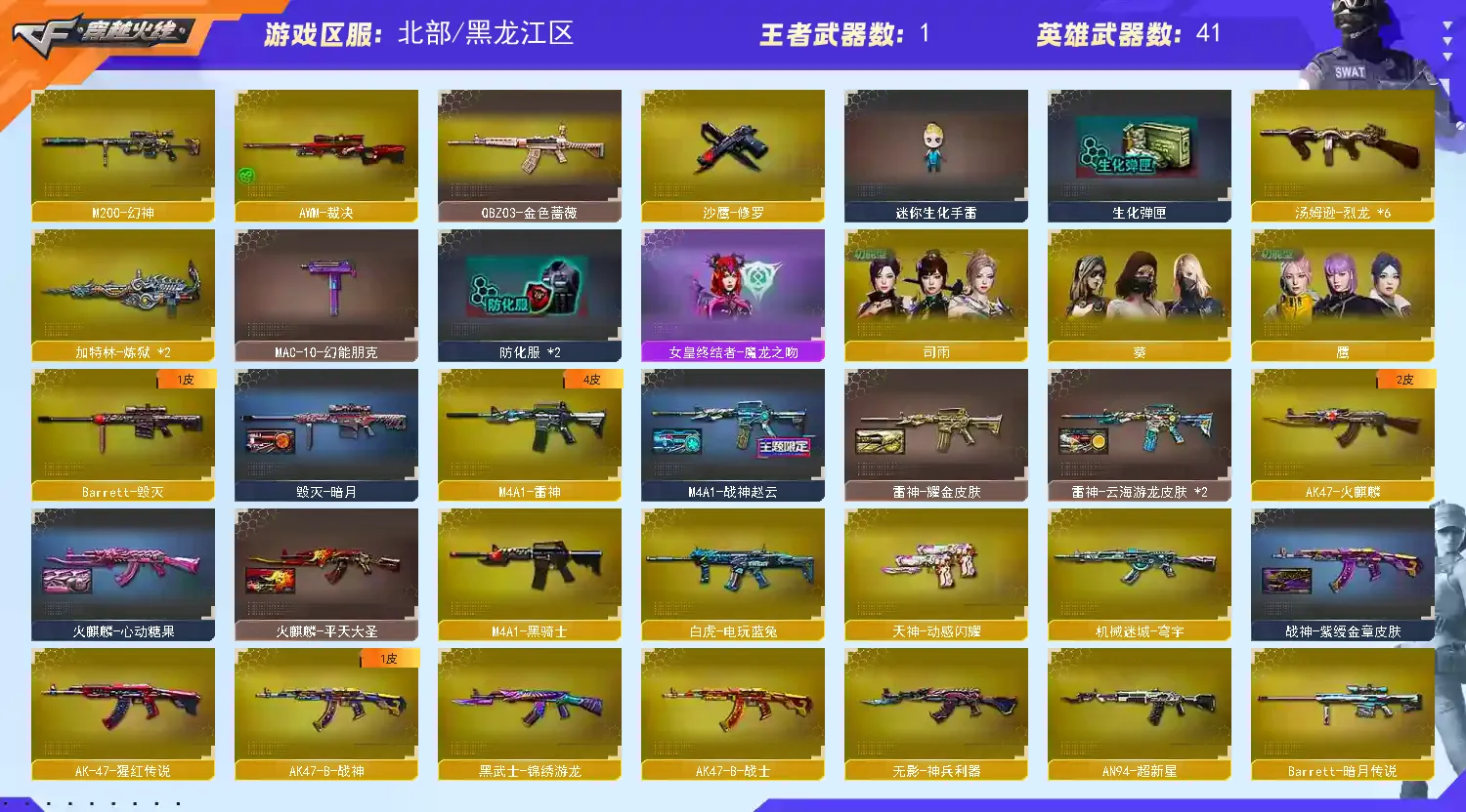 【主 武】:M200幻神、烈龙X6、死亡之眼、王者之魄、炫金火麒麟、炫金武士、火麒麟、雷神(战神赵云)、黑骑士、QBZ金色蔷薇、AK猩红传说、AK战士、AK战神、白虎电玩蓝兔、雷神精英刀锋、毁灭、裁决、Barrett金色蔷薇、Barrett暗月传说、炼狱、冰龙粉碎者、苍雷、金魔等各种活动武器