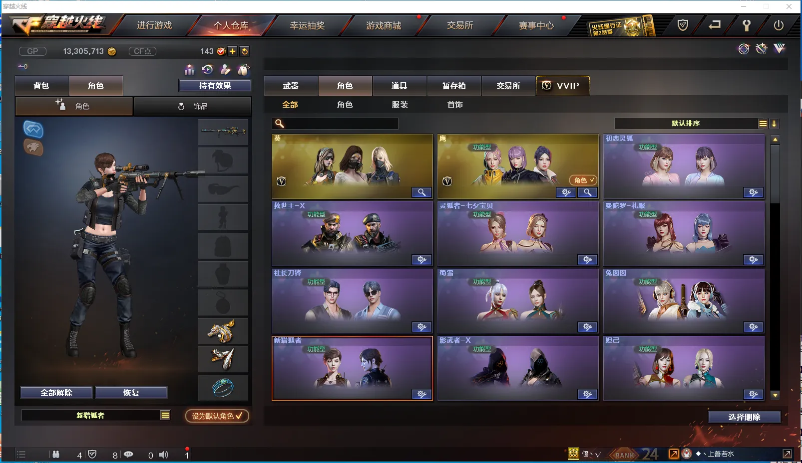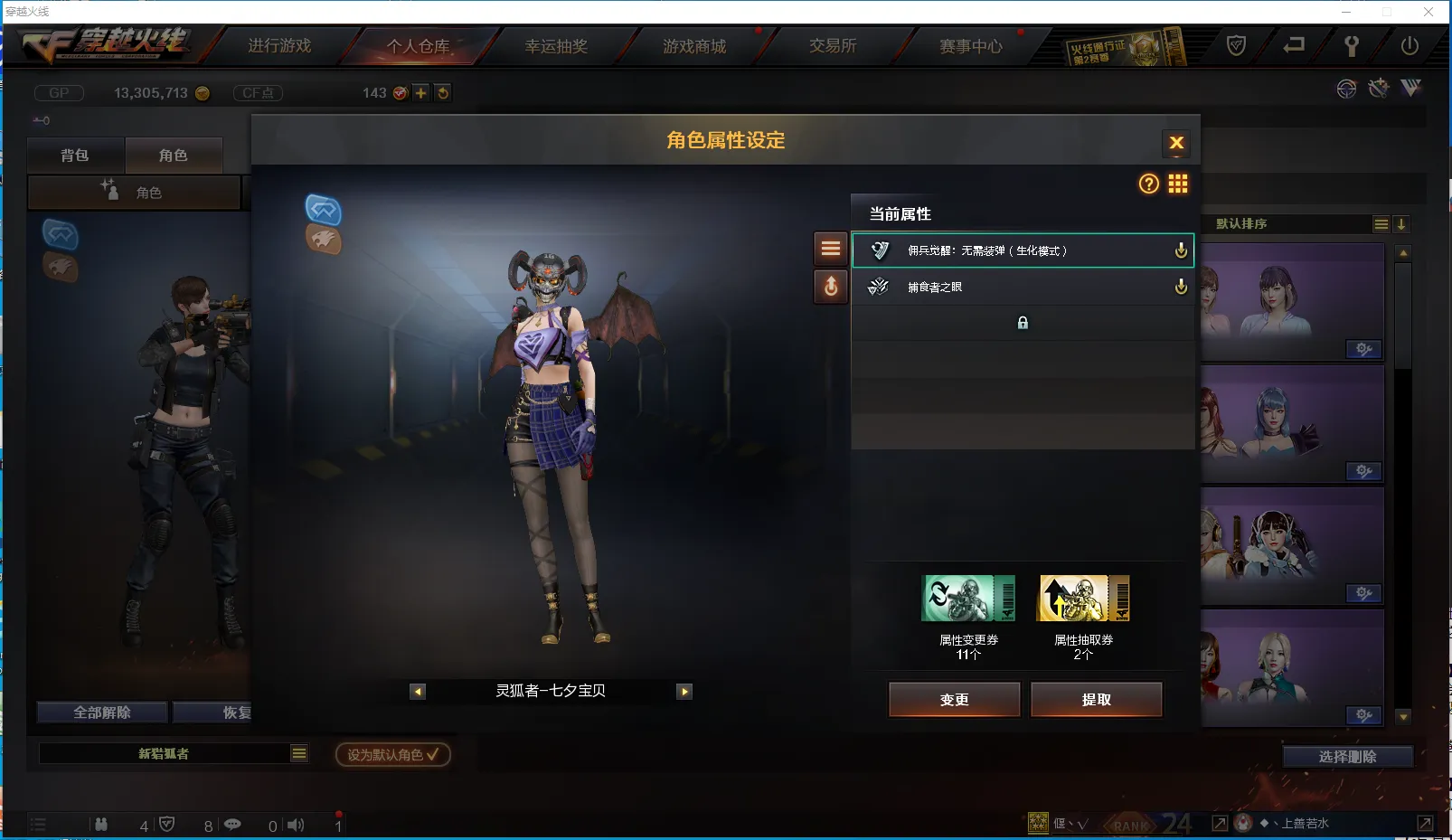 【角 色】:CFVIP2、葵、鹰、初恋灵狐、曼陀罗礼服、妲己、新猎狐者、社长刀锋、灵狐者七夕宝贝(佣兵觉醒无需换弹、捕食者之眼)、双蛇戒指、双龙戒指、锋芒之环