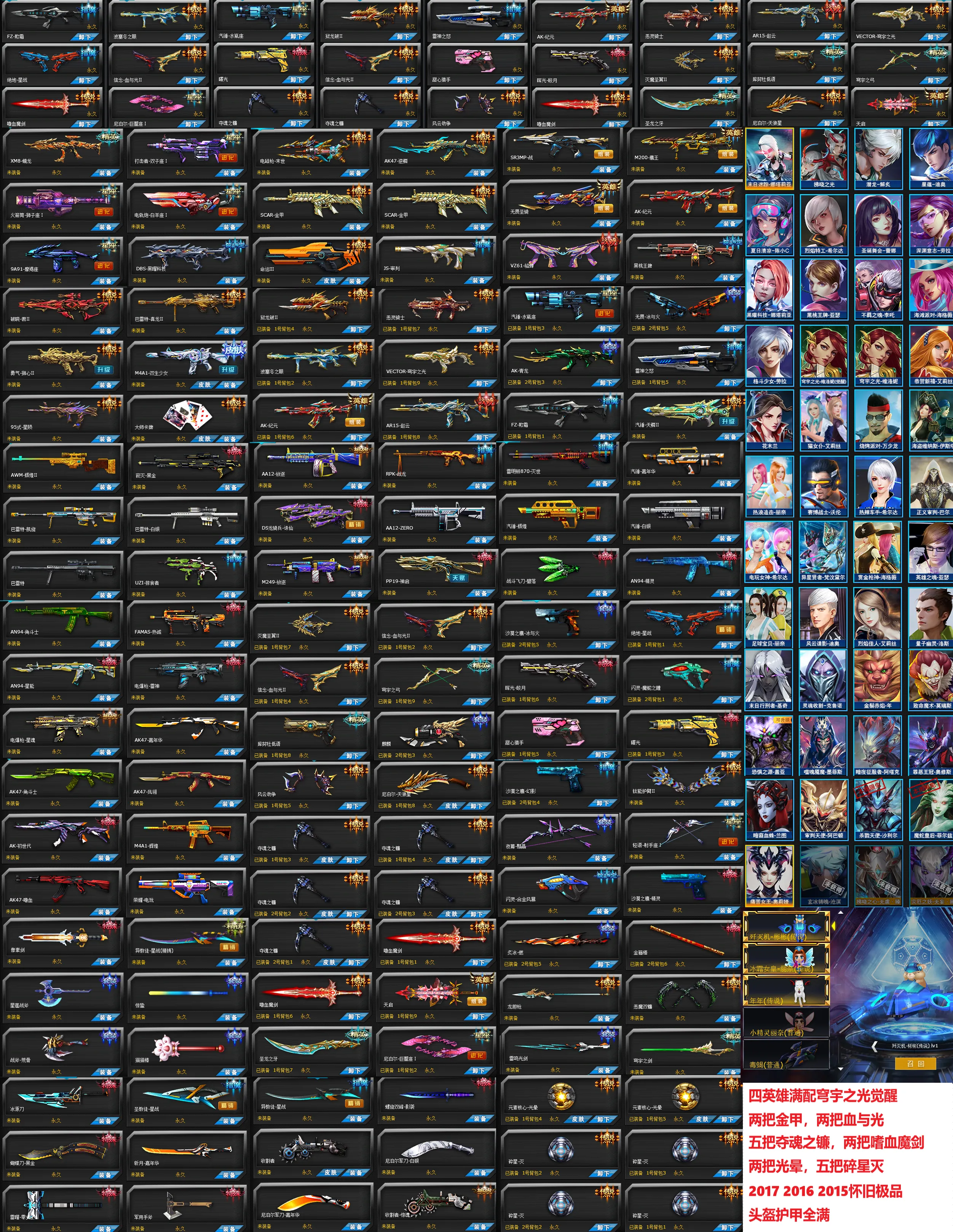 2015 2016 2017怀旧欺霜掠食者雷神之怒男女亚瑟,狱龙破恶灵骑士波塞冬之眼穹宇之光纪元满配赵云水瓶座冰与火套装青龙套装天鳞破晓君真龙狮心双生少女星陨,大师卡牌电磁枪逆鳞金甲命运鹰王满配圣骑满配貂蝉螭龙双子座狮子座白羊座魔羯座黑曜科技黑桃王牌,无敌套巴雷特凯旋黑金雷明顿灭世角斗士热诚电报枪雷神辉煌,灭魔圣翼信念血与光羊枪绝地星战皎月闪灵魔蛇之瞳甜心猎手曙光护臂射手座风云劫争,天狼星夺魂之镰嗜血魔剑天启圣龙之牙巨蟹座金箍棒龙胆枪夺魂之镰像素剑影袭收割者光晕碎星灭。至尊帝王超级玩家大元帅李吒维洛妮,花木兰热浪追击丽奈异形贤者赏金枪神足球宝贝年兽墨菲斯基奇罪恶王冠蜘蛛兰图阿巴顿痛苦女王。