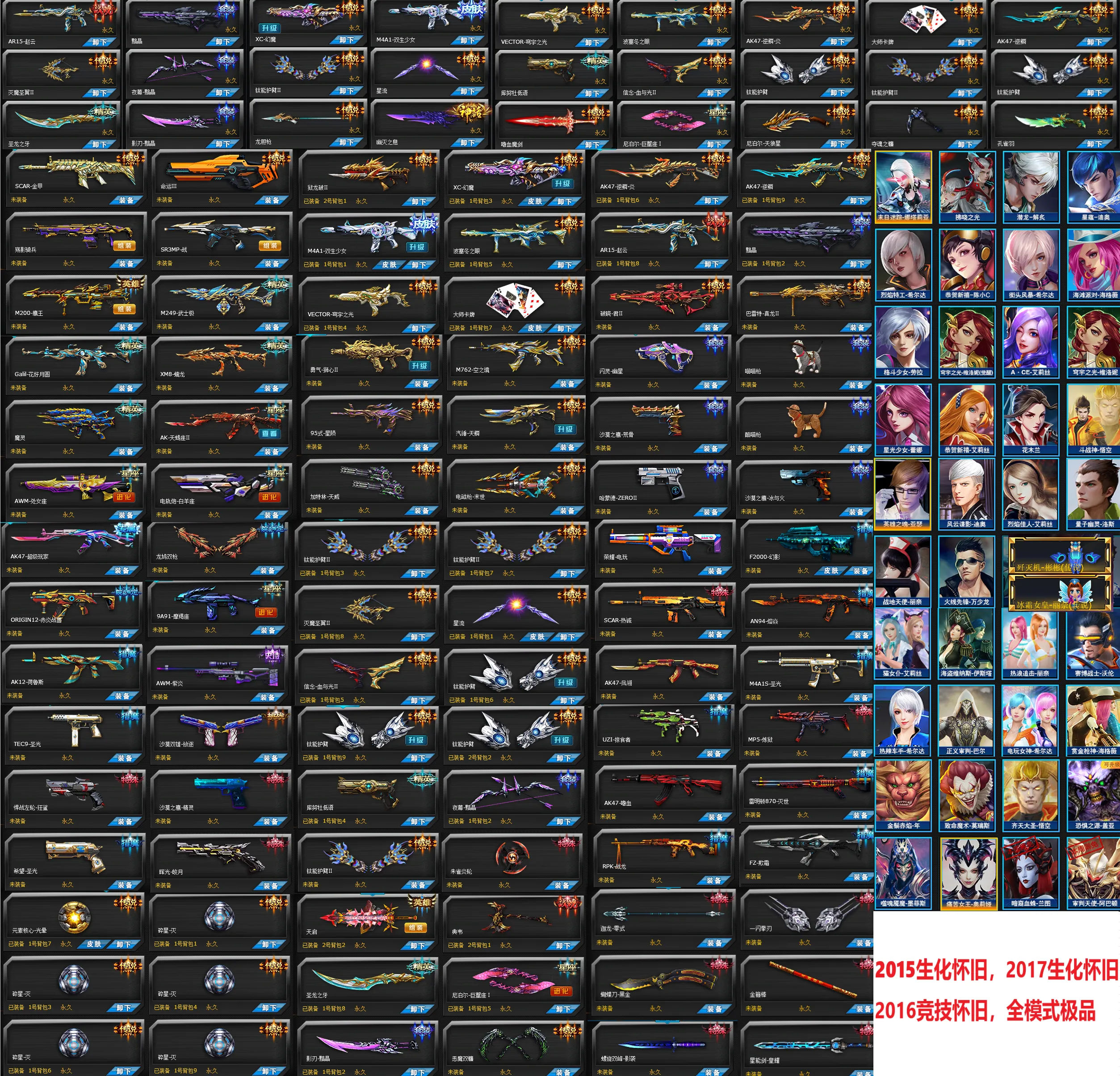 幻魔,护臂,龙胆枪凤舞双生少女,穹宇之光觉醒,波塞冬三切,卡牌,金甲命运,狱龙破灭魔圣翼,破晓君,真龙,白羊座魔羯座处女座,天蝎座II鹰王满配,狮心空之镜,星陨天威天鳞电磁枪,星流影袭幻影灭世掠食者巨蟹座,天启朱雀炎轮圣龙之牙金箍棒黑金星能剑,欺霜。
