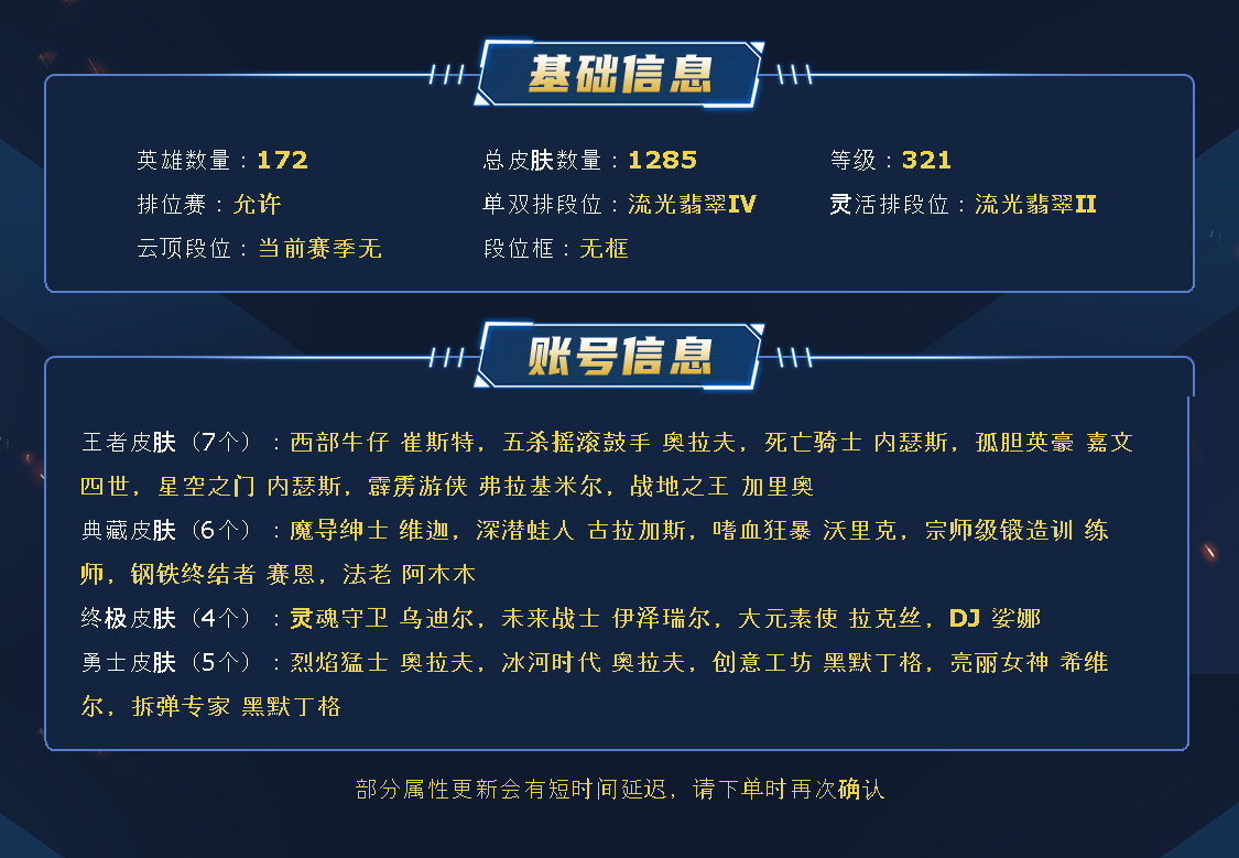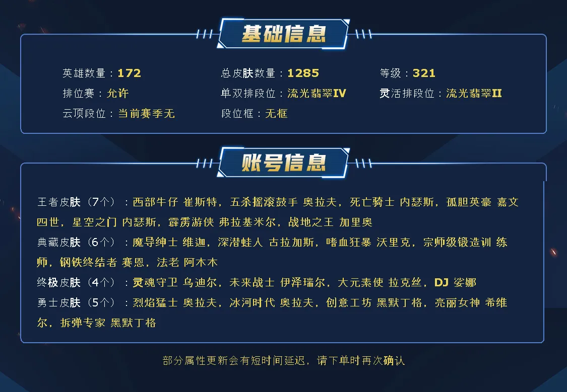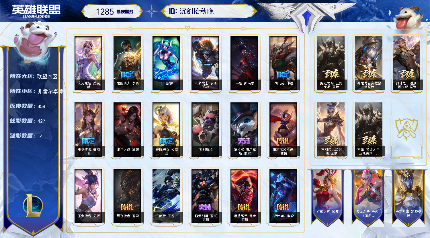 【全英雄可排位792原皮肤】烈焰美人薇恩、玉剑传说舞剑仙刀妹、司马懿仲达、广寒仙子嫦娥、蛇年蛇女、蛇年安妮、春晖神女拉克丝、电玩女神阿狸、电玩女神女枪、电玩勇者锐雯、龙年琴女、龙刀、醒狮大嘴、虎痴之拳蔚、美猴王孙悟空、玉净夜叉女警、神龙烈焰金克丝、花木兰、张辽文远、女帝卡特琳娜、泳池派对女警、征服者卡尔玛、征服者韦鲁斯、至高天劫、至高天薇古丝、星之守护者奎因、太空律动莎弥拉、屠龙勇士奥拉夫、大元素使、灵魂守卫、DJ、未来战士EZ、大魔王提莫、地底世界、电玩人马、冰雪节发条、钢铁军团拉克丝、冠军掠夺者、冠军之隐劫、惊悚派对稻草人、克格汪、万圣节莫甘娜、觅心魔灵发条、觅心游侠卢锡安、觅心之翼奎因、甜心宝贝琴女、甜心之翎洛、甜心之羽霞、万圣节人马、泳池宝石、勇者阿狸、勇者豹女、制胜金靴、FNATIC全套、暗星锤石、奥德赛凯隐、黑夜使者亚索、黎明使者锐雯、律政大亨蒙多、神拳、神王盖伦、屠龙勇士潘森、未来战士女警、星之守护者阿狸、星之守护者金克丝、源计划寒冰、貂蝉、关羽、黑夜使者厄斐琉斯、吕布、西部魔影锤石、西部魔影诺手、孙尚香、小恶魔小炮、腥红之月希维尔、战斗教授男枪、赵云、真实伤害亚索