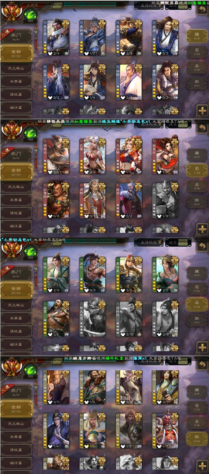 SP关羽、SP曹仁、SP蔡文姬、乐进、曹昂、诸葛诞、朱灵、文聘、SP姜维、张春华、钟会、曹冲、郭淮、满宠、界王异、界曹操、界司马懿、界夏侯惇、界张辽、界许褚、界郭嘉、李典、曹真、韩浩史涣、陈群、曹、曹休、钟繇、司马朗、王基、李通、郭皇后、孙资刘放、辛宪英、界甄姬、吕虔、鲁芝、蒯越蒯良、界典韦、界荀彧、界徐晃、杜畿、界曹丕、毌丘俭、界邓艾、张恭、贾逵、界曹植、界曹彰、界满宠、界郭淮、卞夫人、华歆、袁涣、王双、崔琰、阮慧、谋徐晃、谋于禁、界曹休、谋夏侯渊、牛金、界夏侯渊、臧霸、孟达、唐咨、董昭、势夏侯尚