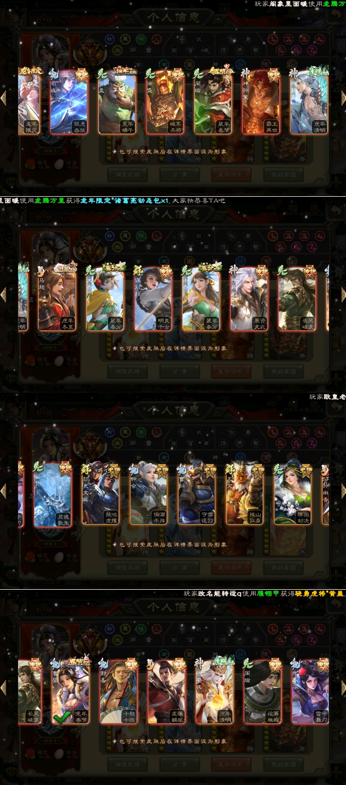 兔年春节.曹婴(动)、能工巧匠.马钧(动)、龙年限定.荀彧(动)、驱虎吞狼荀彧(动)、雪中舞刃.张春华(动)、十胜十败.郭嘉(动)、役使鬼神.左慈(动)、肝胆相照.星甘宁(动)、虎年冬至张鲁(动)、明良千古.刘赪(动)、霸王再世.神孙策(动)、虎年清明.神郭嘉(动)、虎年清明.神荀彧(动)、风舞魔.神诸葛亮(动)、兼资文武.神吕蒙(动)、破军杀将.徐盛(动)、灵魂歌王.留赞(动)、兔年端午.黄盖(动)、鼠年春节.周瑜(动)、运筹帷幄.周瑜(动)、鼠年春分小乔(动)、长风破浪.凌统(动)、鼠年春分.大乔(动)、龙骧麟振.刘备(动)、蛇年限定.孙寒华(动)