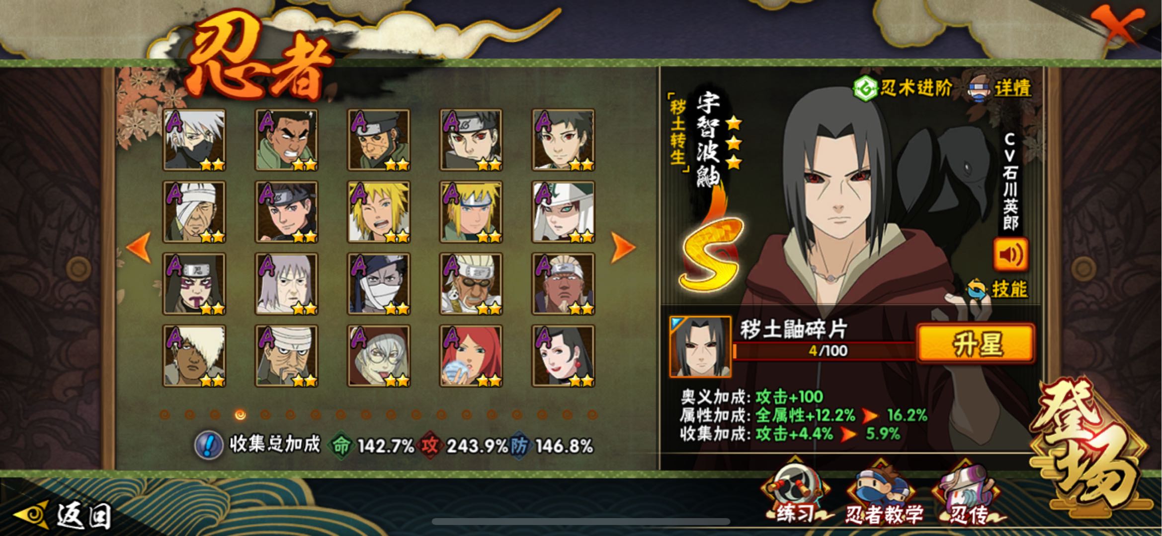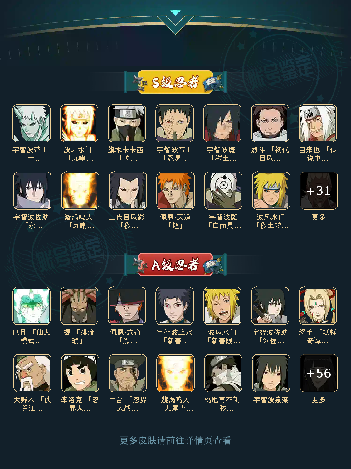 仙人自来也 纲手 波风水门 百战水门 猿飞日斩 千手柱间 宇智波斑 宇智波鼬 舞之自来也 大蛇丸 百战大蛇 秽土四代 秽土三代 秽土长门 仙人兜 黄猿九喇嘛鸣人 紫狗永恒佐助 樱婊忍战樱 秽土鼬 普通自来也 百豪纲手 死门凯 二代扉间 秽土二代 秽土初代 秽土柱间 白面具 须佐卡卡西 小胡子鬼灯幻月 雷影 土影 无 佩恩 百战佩恩 青年柱间 创立初代 秽土斑 青年斑 解斑 须佐止水 虎皮 破面带土 红夜带土 罗砂 秽土三代风影 忍战雷影 三代雷影 金角银角 秽土半藏 忍战大野木 小土豆 天道超 大筒木桃式 大筒木金式 钢铁之躯凯 桀骜之刃阿斯玛 狂野之鲨鬼鲛 飞段 黑飞段 百豪樱 忍战李 大卡卡西 五代水影照美冥 宇智波鼬 仙鸣 九尾查克拉鸣人 鹰佐 奇拉比 青年艾 半蛇兜 晓蛇 新春鼬 面麻 须佐佐助 疾风咒印佐助 忍战宁次 忍战天天 最终章雏田 幻容卡卡西 神卡 忍战卡卡西 泳装卡卡西 忍战凯 青春哥 惊门凯 爱情哥 新春止水 新春水门 青年水门 青水 新春我爱罗 泳装照美冥 侠隐照美冥 侠隐纲手 侠隐兜 漂泊再不斩 漂泊佩恩 漂泊二代 漂泊小南 漂泊佩恩 三船 青年三船 青年长门 泳装南 新春南 黑绝 新春大蛇丸 晓创生角度 晓创生蝎 晓创生飞段 泳装鼬 鲛肌融合鬼鲛 新春迪达拉 秽土迪达拉 恶灵之影飞段 暴怒带土 忍战黄土 卑留呼 桃博 黑土