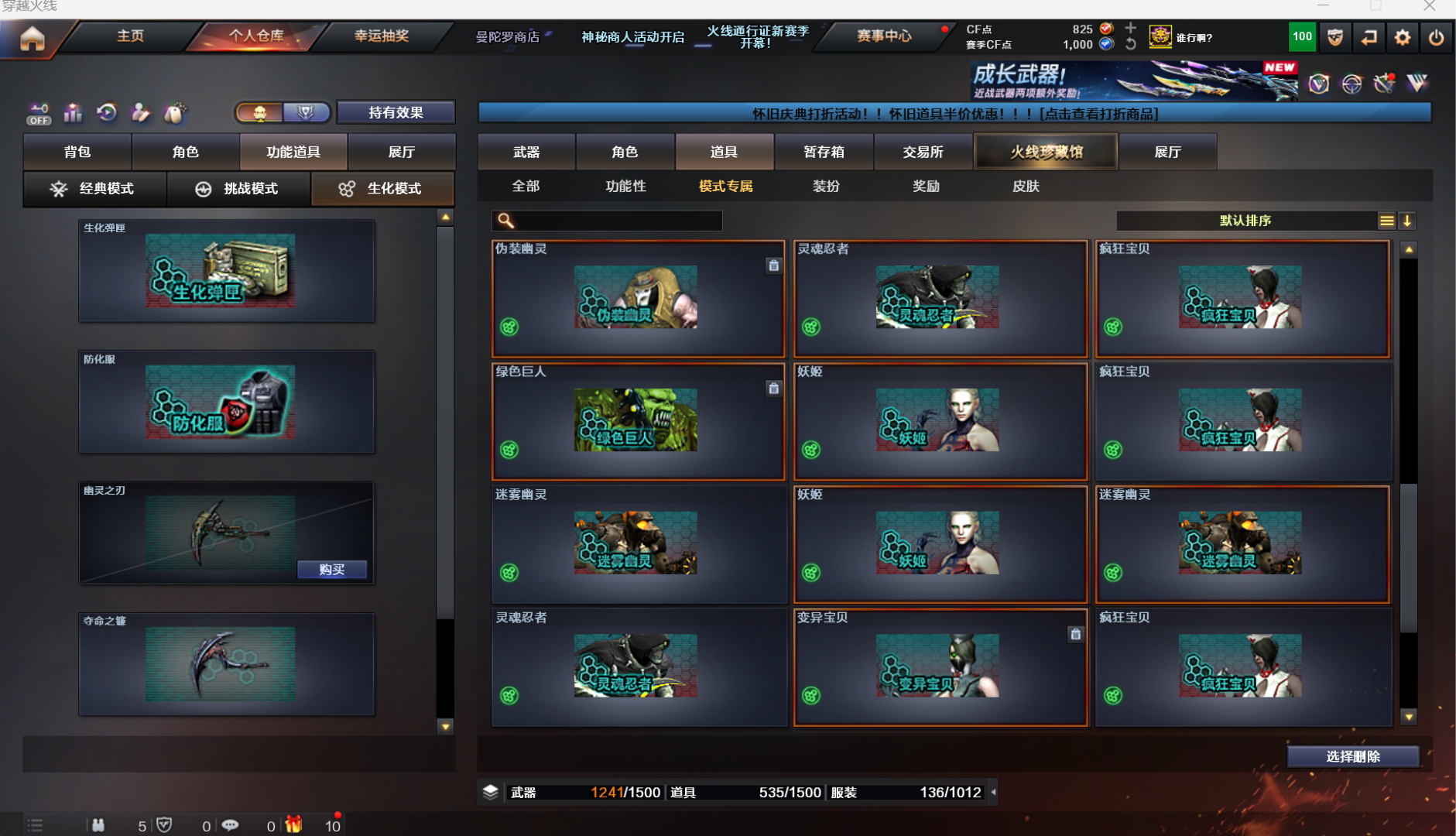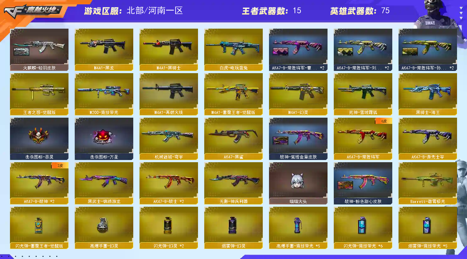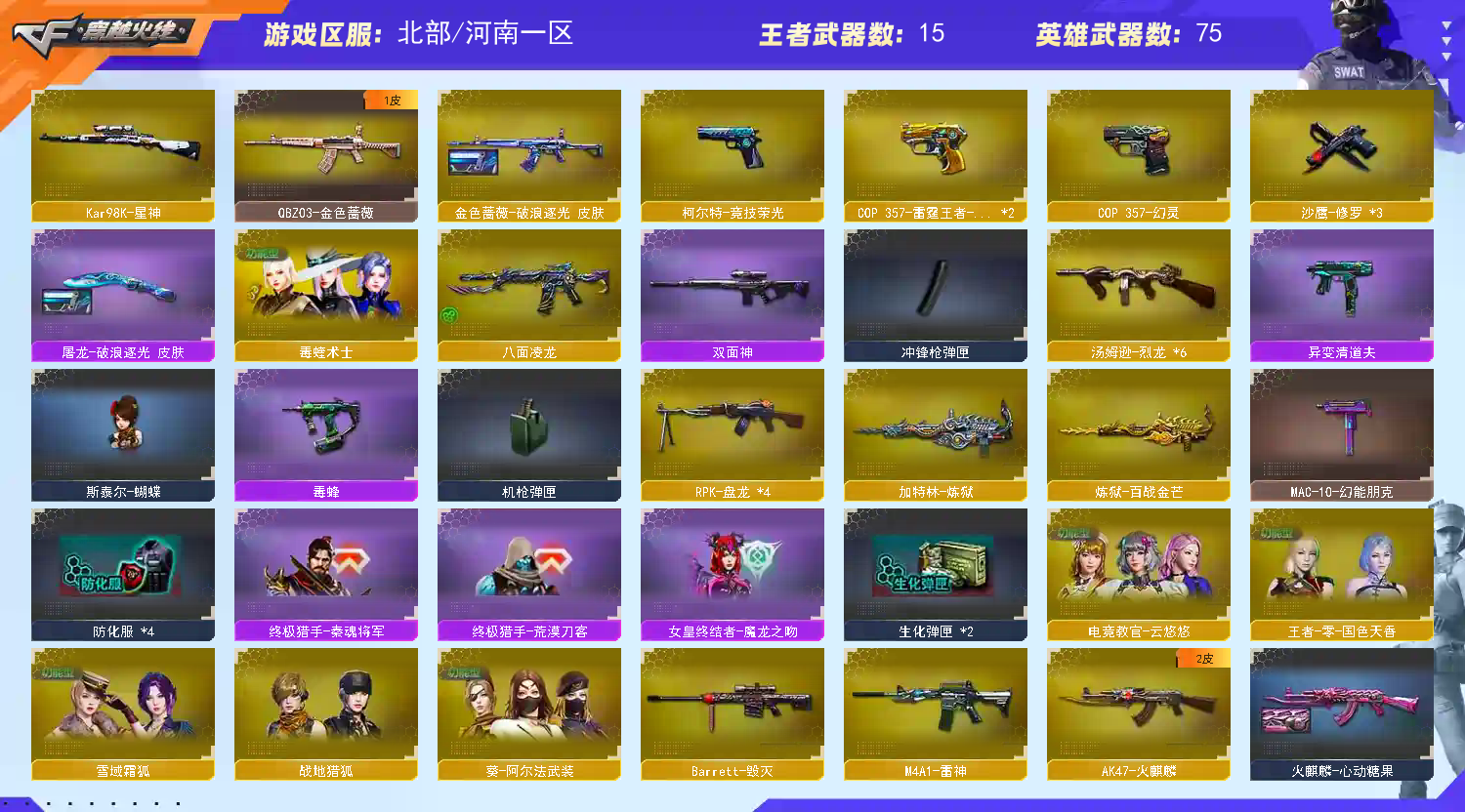 生化爆破全装⭐4盘6烈蝴蝶毒蜂清道夫⭐四防毒蝰术士云悠悠⭐八面玲珑⭐幻灵套装⭐m200竞技荣光套装⭐星神⭐双炽芒蝶刃⭐双面神⭐qbz蔷薇⭐白虎电玩蓝兔⭐王击⭐王啸⭐3个英雄cop⭐柯尔特竞技荣光⭐全弹夹⭐全猎手皮肤。