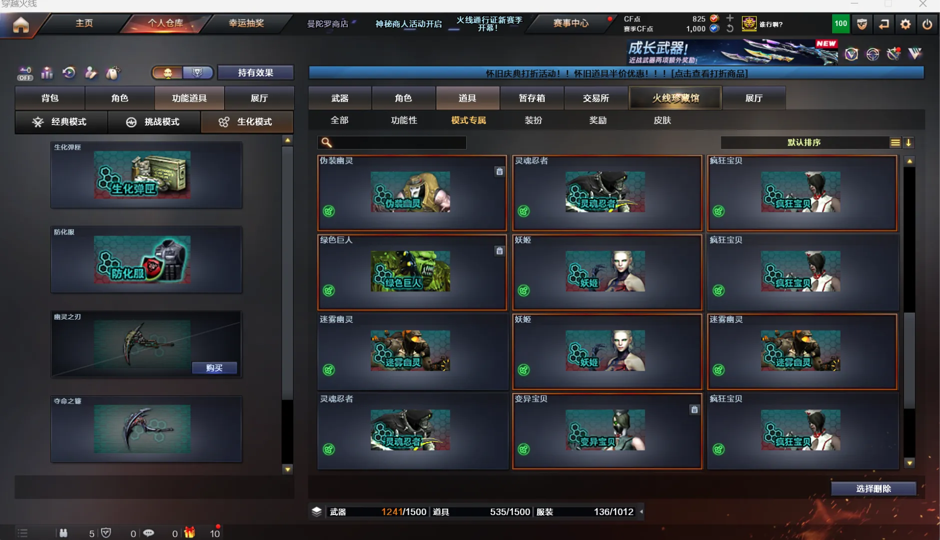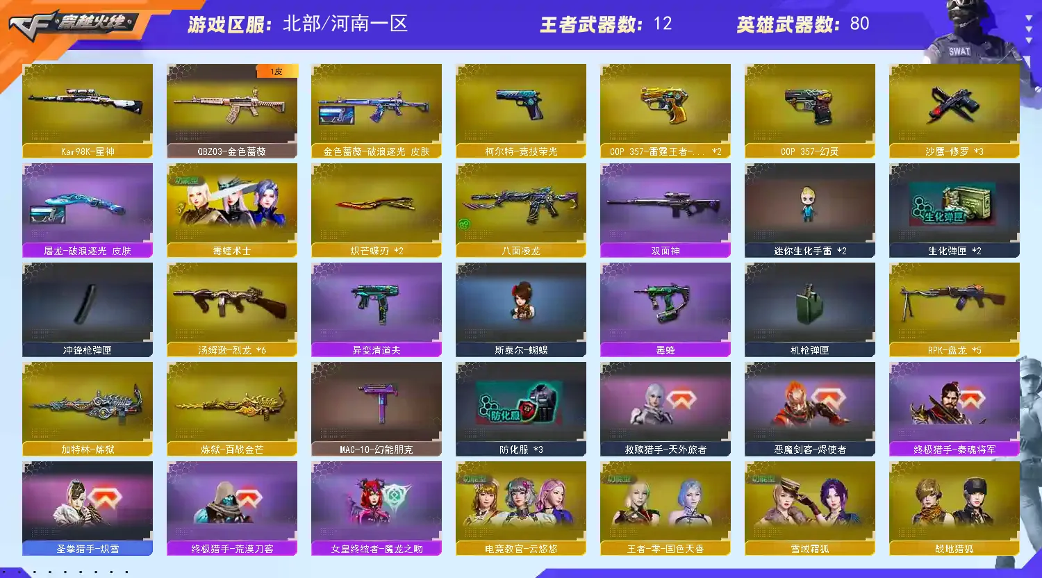 生化爆破全装⭐5盘6烈蝴蝶毒蜂清道夫⭐四防毒蝰术士云悠悠⭐八面玲珑⭐幻灵套装⭐m200竞技荣光套装⭐星神⭐双炽芒蝶刃⭐双面神⭐qbz蔷薇⭐白虎电玩蓝兔⭐王击⭐王啸⭐3个英雄cop⭐柯尔特竞技荣光⭐全弹夹⭐全猎手皮肤。