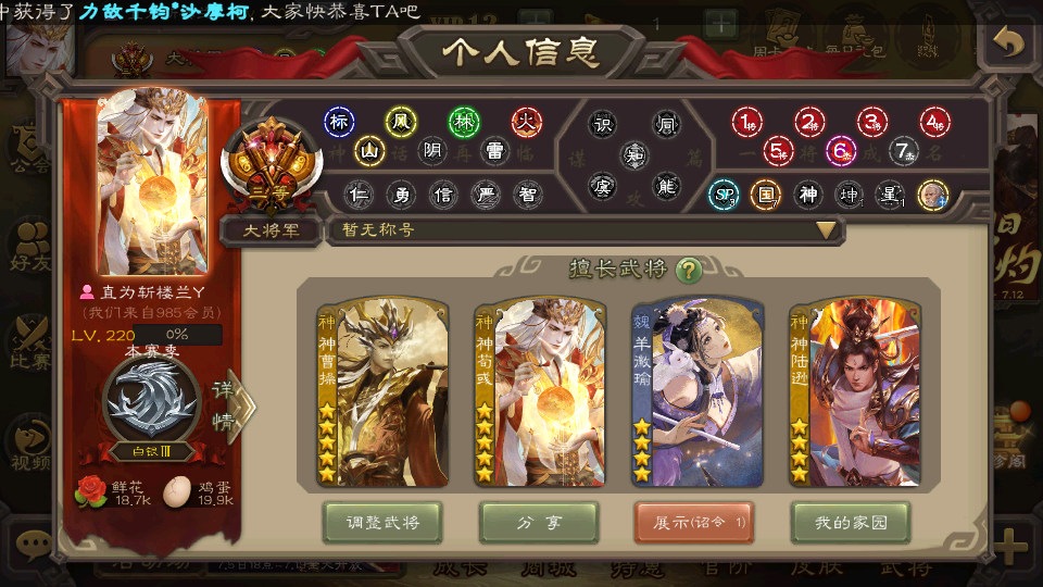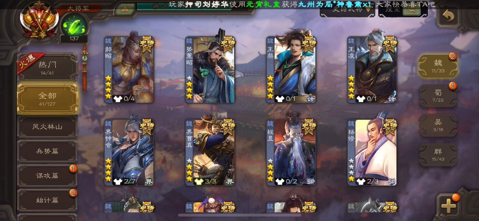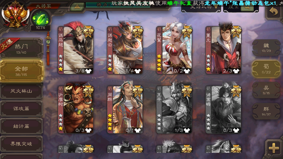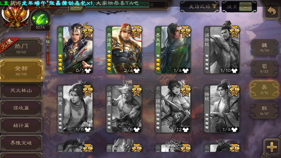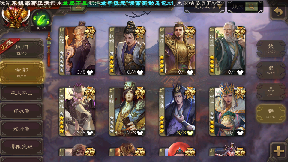 大将军,势辛宪英,势董昭,动神荀彧、动神曹操、神孙策、动羊徽瑜、张仲景、界沮授,花鬘、杜预、动界左慈、刘璋、王凌、动界钟会、周群、吴景、动界李儒、动祢衡、动神陆逊、