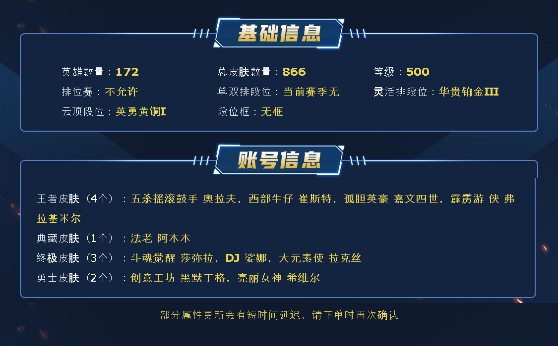此号已在公安机关信息登记虚拟财产备案,租用期间禁止使用美化包第三方软件外挂等,如导致封号或冻结必将追究到底向平台找到下单IP、手机号实名、下单充值的实名找到本人法院传票到封号者家!把封号者起诉到法院追回账号损失切勿以身试法弄的大家都不好看!感谢支持与配合!根据《刑法》第二百七十五条故意毁坏财物罪:故意毁坏公私财物数额较大或者有其他严重情节的处三年以下有期徒刑、拘役或者罚金数额巨大或者有其他特别严重情节的处三年以上七年以下有期徒刑!切勿以身试法!