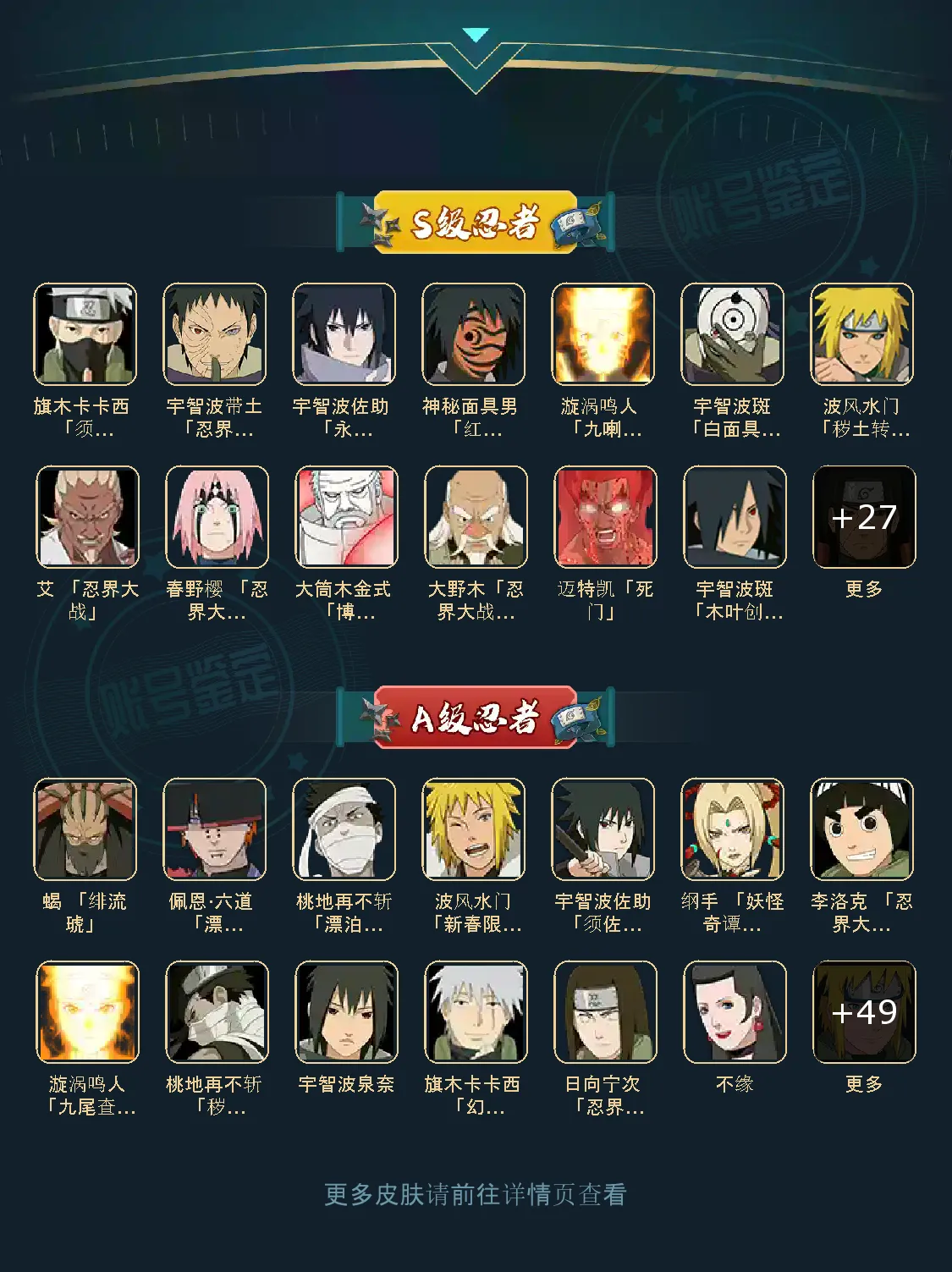 40S/55A/V14/战力1429W S忍:猿飞日斩、宇智波佐助 「永恒万花筒」、神秘面具男 「红夜之刃」、春野樱 「忍界大战」、大筒木金式 「博人传」、漩涡鸣人 「九喇嘛连结」、大野木「忍界大战」、迈特凯「死门」、宇智波斑「木叶创立」、宇智波带土「忍界大战」、千手柱间「秽土转生」、罗砂「四代目风影」、宇智波鼬「秽土转生」、自来也「舞之豪杰」、自来也「舞之豪杰」、宇智波斑「白面具」、神秘面具男、大蛇丸、自来也「仙人模式」、自来也「仙人模式」