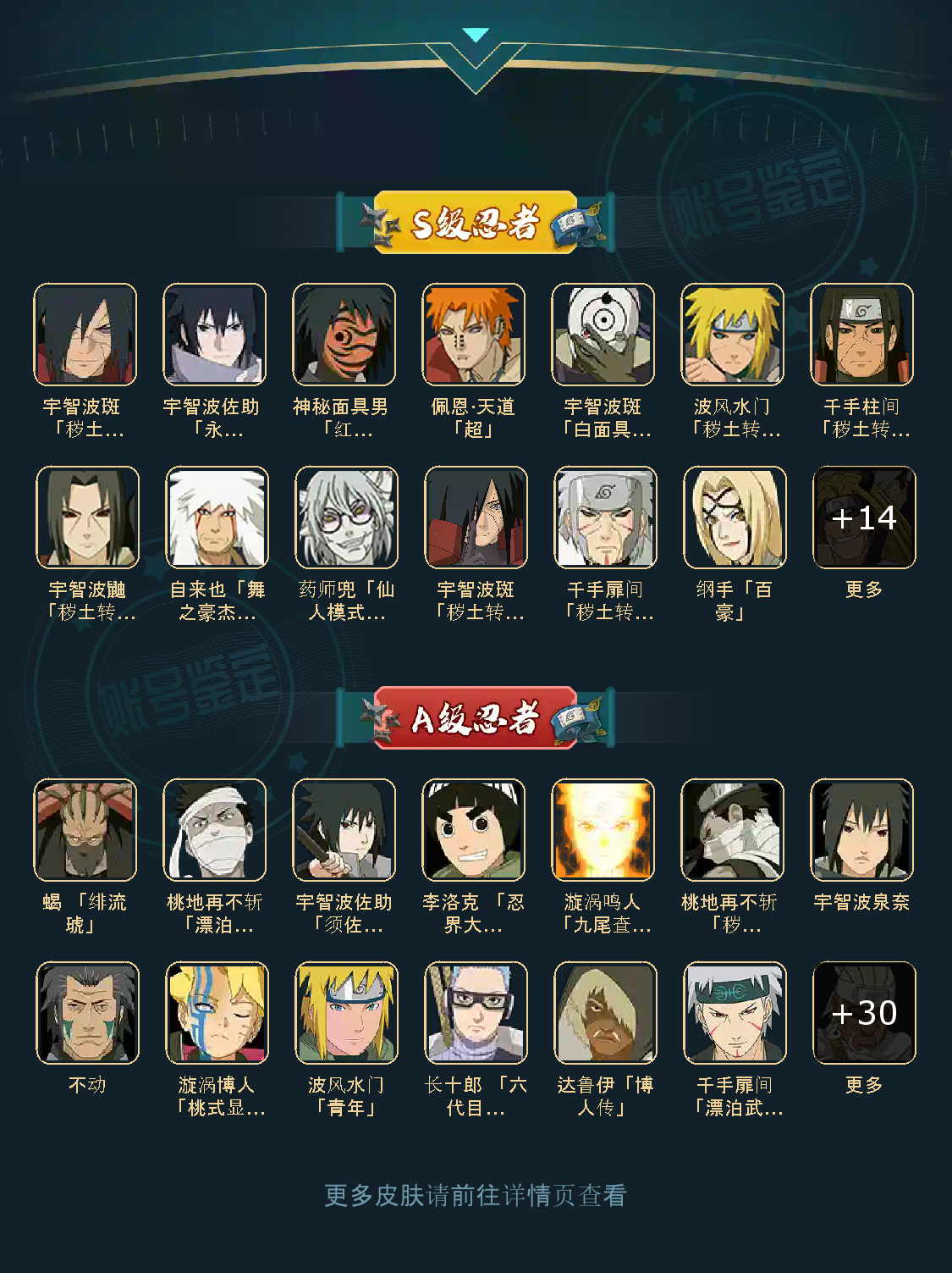 战力:1488W+;S忍26个;A忍37个,通灵兽19个,S忍:大蛇丸波风水门宇智波斑永恒万花筒佐助普通自来也百豪纲手普通纲手秽土水门秽土猿飞豪杰自来也秽土扉间千手扉间千手柱间秽土柱间秽土斑须佐鼬秽土鼬神秘面具男白面具红夜面具男四代艾金角银