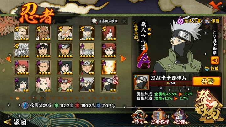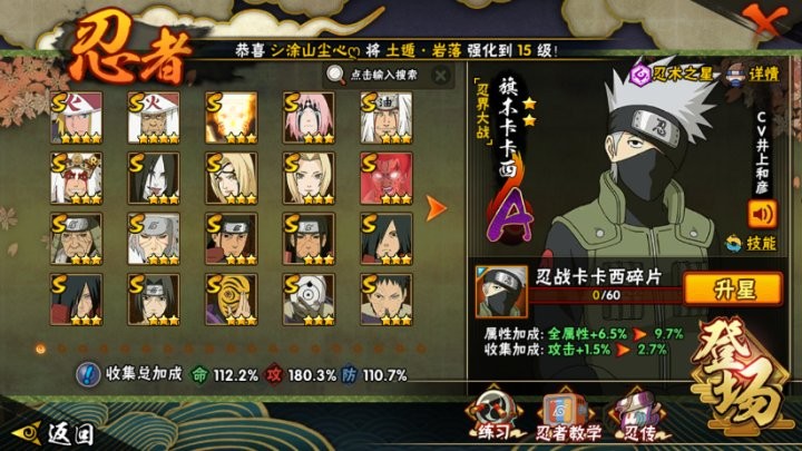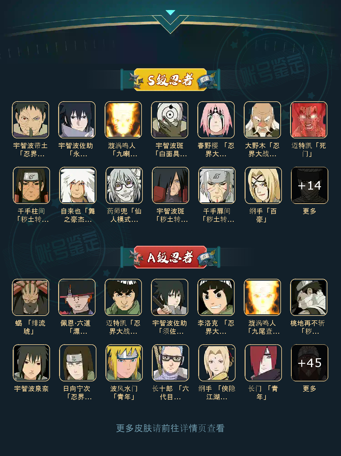 S忍26个;A忍35个,通灵兽20个,S忍:大蛇丸九喇嘛鸣人忍战樱普通自来也豪杰自来也普通纲手死门凯秽土水门秽土猿飞猿飞日斩秽土扉间千手柱间秽土柱间秽土
