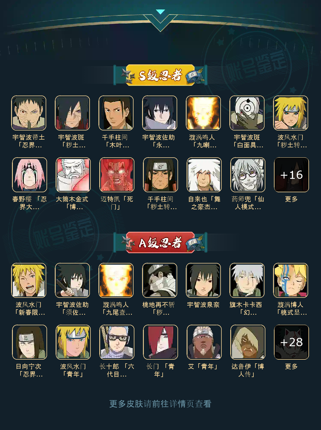 战力:1222W+;VIP11级;S忍29个;A忍37个,通灵兽19个,S忍:九喇嘛鸣人永恒万花筒佐助忍战樱普通自来也豪杰自来也大蛇丸百豪纲手普通纲手死门凯波风水门秽土水门猿飞日斩秽土猿飞千手扉间秽土扉间木叶创立柱间秽土斑秽土解斑白面具忍战