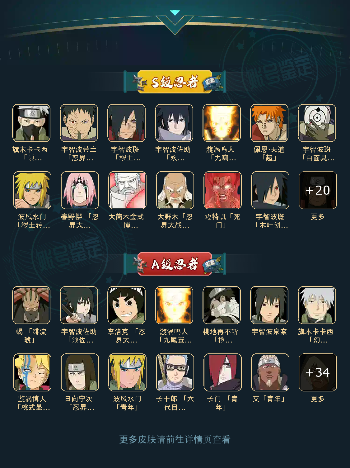 战力:1490W+;S忍30个;A忍39个,通灵兽20个,S忍:普通纲手猿飞日斩九喇嘛鸣人永恒万花筒佐助忍战樱仙人自来也大蛇丸百豪纲手普通自来也豪杰自来也死门凯波风水门秽土水门秽土猿飞秽土扉间秽土柱间秽土斑木叶创立斑须佐鼬秽土鼬白面具忍战带
