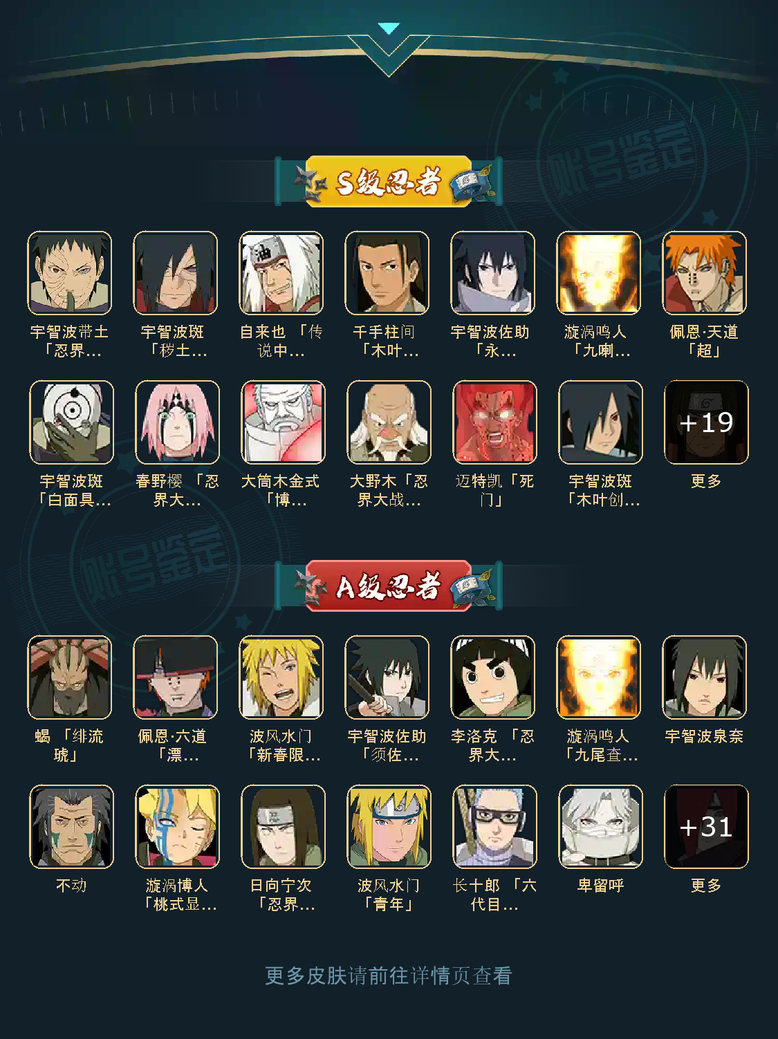 战力:1568W+;S忍30个;A忍39个,通灵兽20个,S忍:普通纲手波风水门猿飞日斩九喇嘛鸣人永恒万花筒佐助忍战樱仙人自来也大蛇丸死门凯豪杰自来也秽土猿飞秽土扉间秽土柱间木叶创立柱间秽土斑木叶创立斑秽土解斑须佐鼬秽土鼬神秘面具男白面具忍