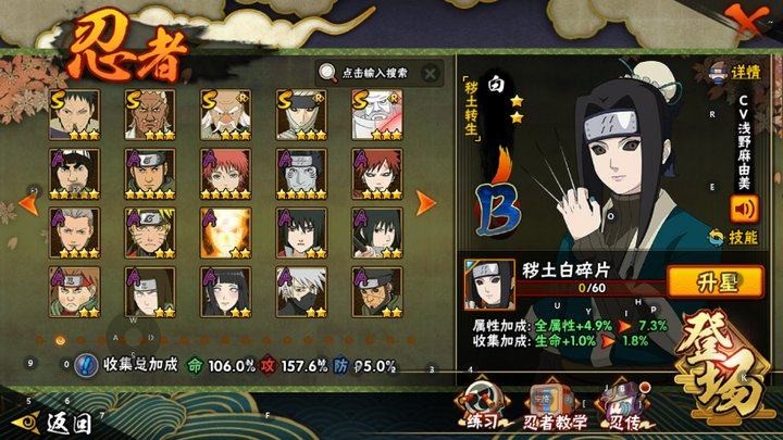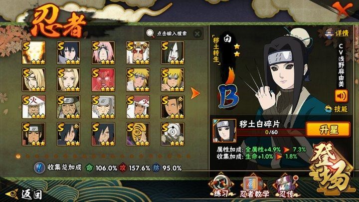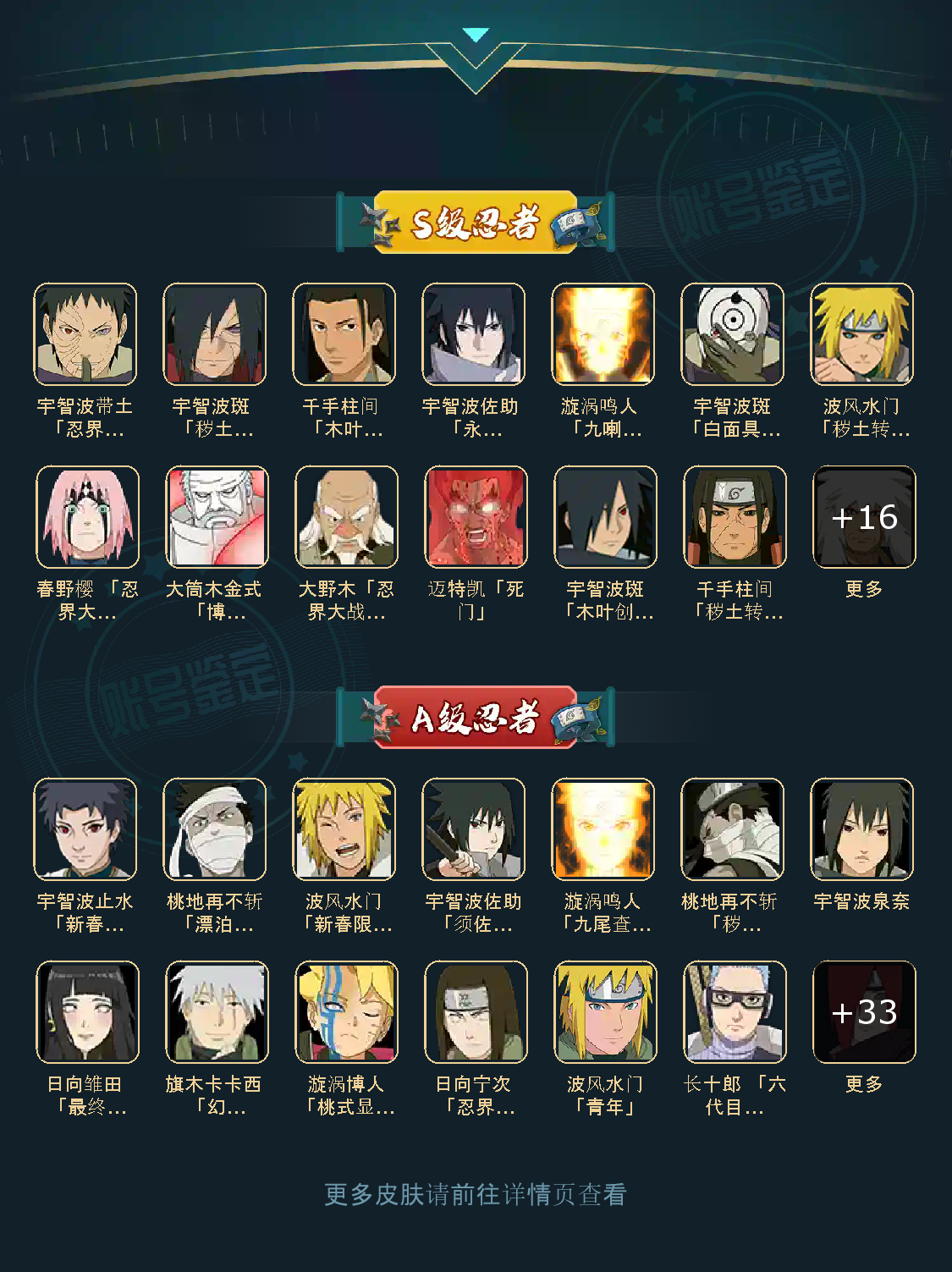 战力:1290W+;VIP11级;S忍25个;A忍39个,通灵兽19个,S忍:九喇嘛鸣人永恒万花筒佐助忍战樱豪杰自来也大蛇丸百豪纲手普通纲手死门凯波风水门秽土水门猿飞日斩秽土猿飞秽土扉间千手柱间木叶创立柱间秽土柱间木叶创立斑秽土解斑神秘面具