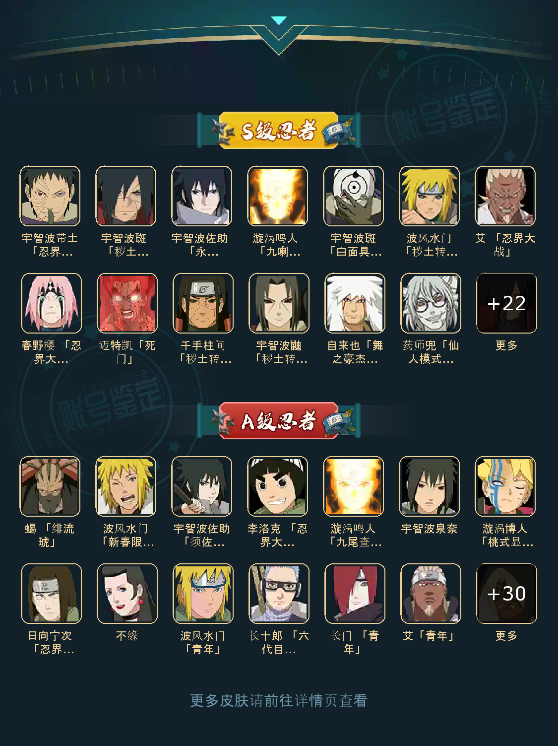 S忍33个;A忍39个,通灵兽21个,S忍:普通纲手大蛇丸波风水门猿飞日斩九喇嘛鸣人永恒万花筒佐助忍战樱仙人自来也普通自来也豪杰自来也百豪纲手死门凯秽土水门秽土猿飞千手扉间秽土扉间千手柱间秽土柱间宇智波斑秽土斑秽土解斑须...