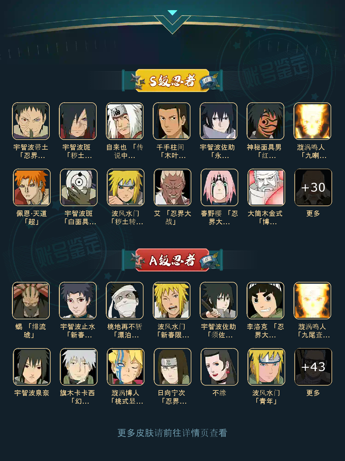 S级忍者(42个);猿飞日斩,宇智波鼬「须佐能乎」,自来也,纲手,波风水门,大蛇丸,恩「天道!,鬼灯双月「-代日水影」,神秘而只男,千手间,艾「四代日雷影」,千手柱间,字智波斑,长门「秽十转生!,德飞日斩「秒土转生!,波风水门「秽十转牛!,无「二代日土影1,纲手「百豪」,千手屌间「秽土转生」,半藏「秽土转生」,宁智波斑「白面县」,艾「三代目雷影」,宁智波斑「秽土转生」,药师兜「仙人模式」,佩思·大道「超」,白来也「舞之豪杰1,宇智波「秽土转生」,罗砂「四代目风影」,千手柱间「秽土转生」,宇智波带土「忍界大战」,宇智波斑「木叶创立」,迈特凯「死门」,人野木「忍界人战」,漩涡鸣人 「九喇嘛连结1,大筒木金式 「博人传」,春野樱 「忍界大战」,神秘面具男「红夜之刃」,宇智波佐助「永恒万花筒」,千手柱间:1本叶创立」,宇智波斑秽土转生·解」A级忍者(51个):宇智波鼬,飞段「死司凭血」,角都,飞段,我爱罗「疾风传」,放木卡卡西,波风水门「新春限定!,迪达拉,,迈特凯,猿飞阿斯玛,干杮鬼鲛,宇智波止水,小南旗木卡卡西「万花筒写轮眼1,角都「地怨1,漩涡鸣人「仙人模式」,奇拉比,宇智波佐助「万花简写轮眼」,照美冥「五代日水影」,春野樱「百豪」,大蛇丸「晓」,秋道丅次「忍界大战小南「日泳装」,我爱罗「忍界大战」,宁智波佐助「疾风传咒印」,宇智波触「新春限定药师兜「半蛇斗」,千代「近松十人卫」,漩涡鸣人「九尾查克拉」