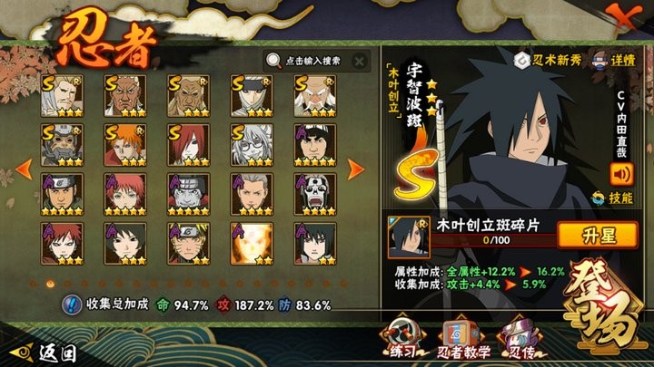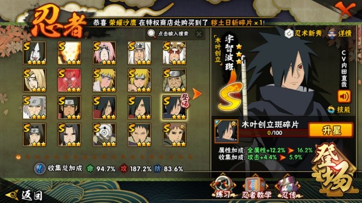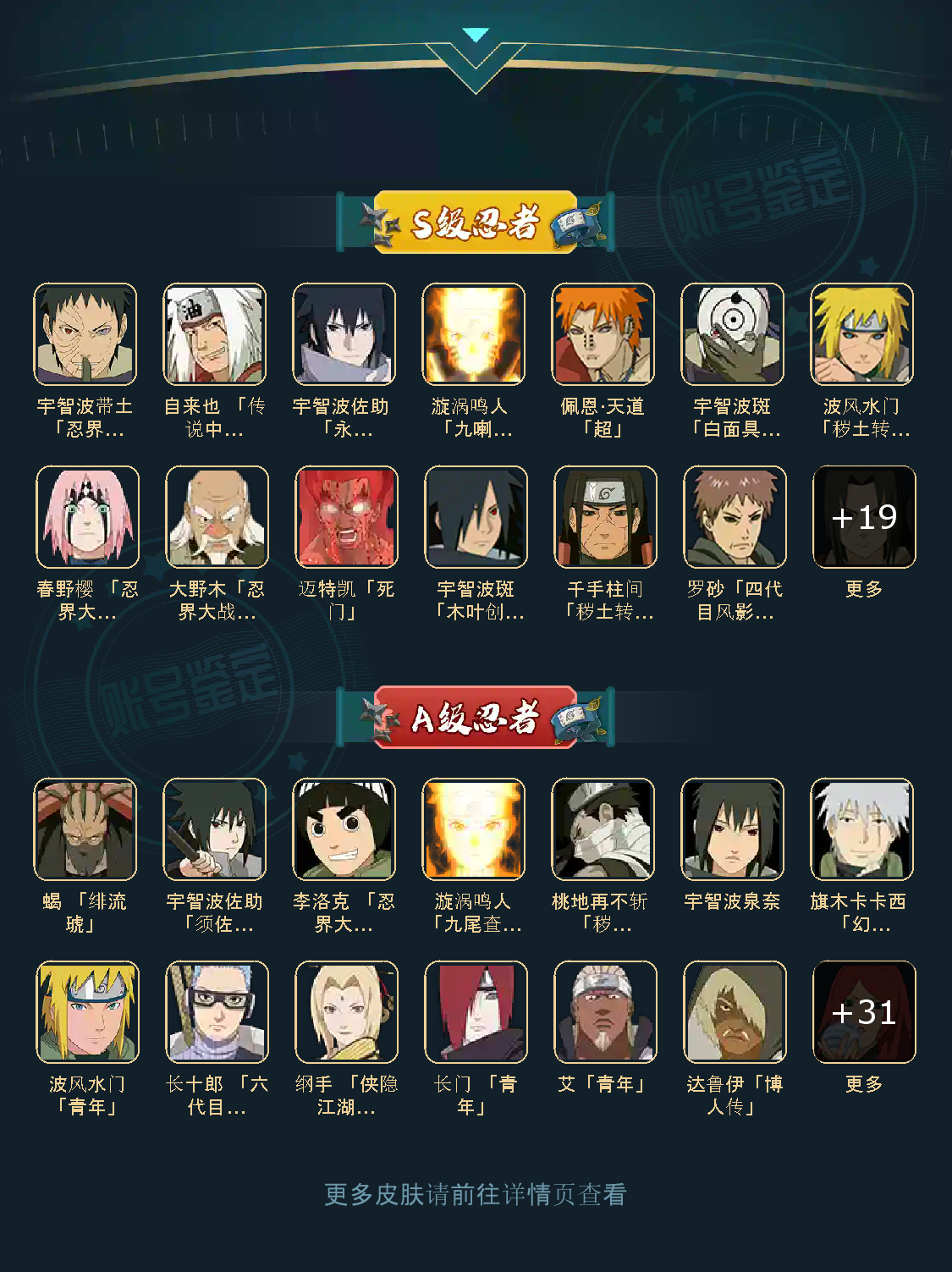 战力:1224W+;VIP11级;S忍30个;A忍39个,通灵兽19个,S忍:大蛇丸九喇嘛鸣人忍战樱普通自来也豪杰自来也百豪纲手死门凯波风水门秽土水门秽土猿飞秽土扉间秽土柱间秽土斑宇智波斑木叶创立斑须佐鼬秽土鼬白面具忍战带土罗砂鬼灯幻月四代
