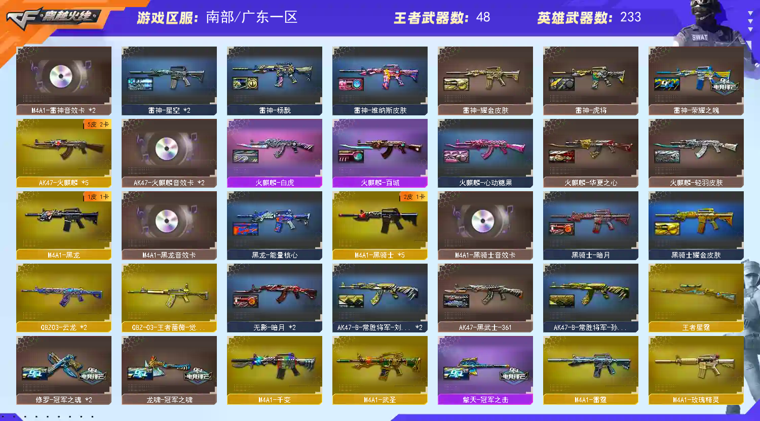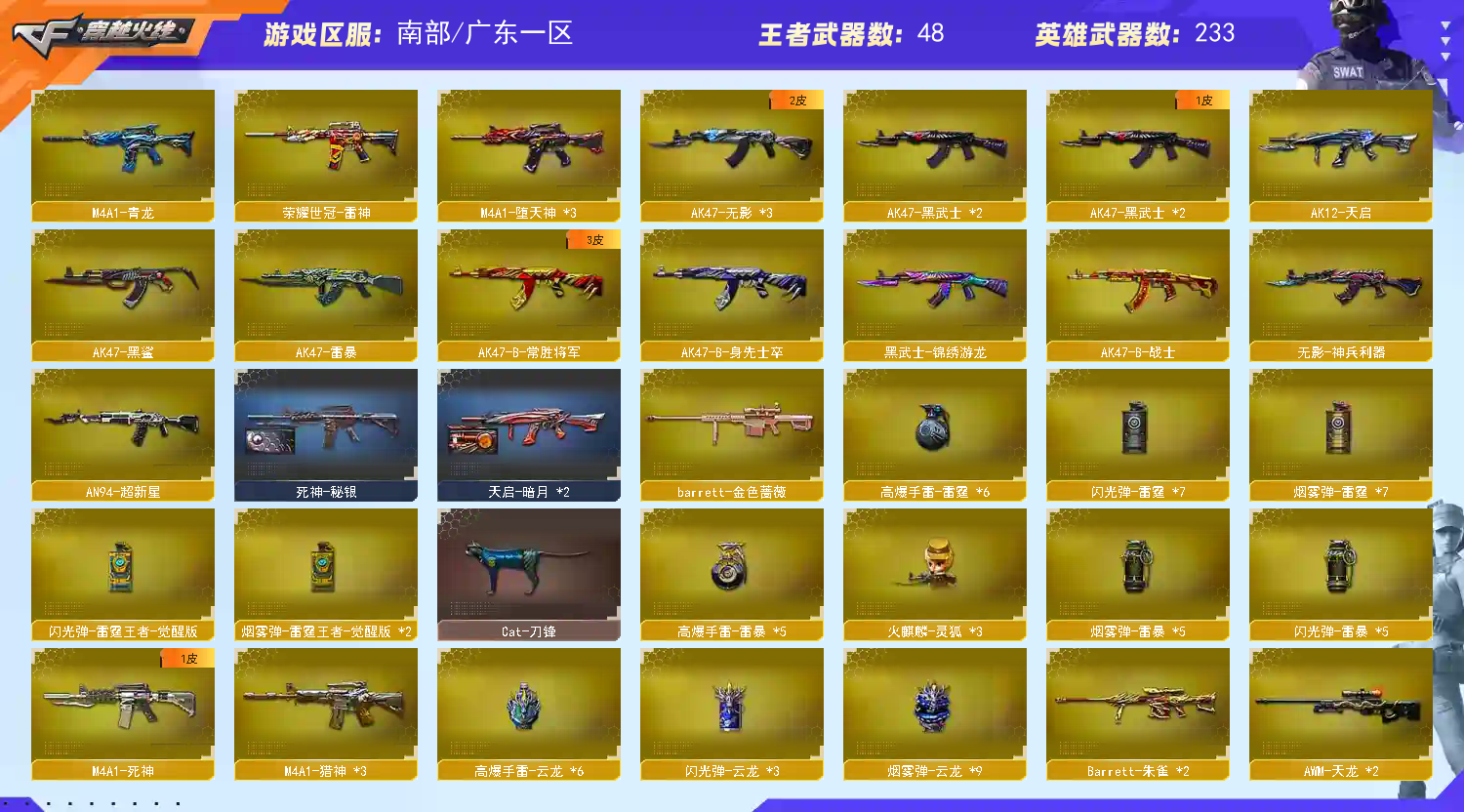 英雄武器:M200-幻神(3)、Barrett-毁灭(2)、 Barrett-极光(7)、Barrett-朱雀(3)、barrett-金色蔷薇、AWM-天龙(2)、AWM-裁决(3)、王者之力-觉醒版、M4A1-堕天神(3)、M4A1-青龙(2)、M4A1-雷神(6)、荣耀世冠-雷神、M4A1-死神、M4A1-黑龙、M4A1-千变、M4A1-黑骑士(5)、M4A1-武圣、M4A1-雷霆、M4A1-猎神(3)、M4A1-玫瑰精灵、王者之魄-觉醒版、王者之武-觉醒版、王者之势-觉醒版、王者冰魄-觉醒版、王者之幻-觉醒版、 Scar Light-白虎(2)、AK12-天启、AK47-火麒麟(6)、AK47-无影(3)、无影-神兵利器、AK47-雷暴、 AK47-黑鲨、AK47-黑武士(2)、AK47-B-身先士卒、AK47-B-常胜将军、AK47-B-战士、AN94-超新星、QBZ03-云龙(2)、QBZ03-金色蔷薇、王者之心-觉醒版、王者之翼-觉醒版、QBZ-03-王者蔷薇-觉醒版、王者之鲨-觉醒版、9A91-烈火(2)、 RPK-盘龙(5)、汤姆逊-烈龙(7)、AA-12-雷霆(2)、加特林-炼狱(3)、COP-堕天神(2)、COP 357-云龙(2)、COP 357-雷霆王者-觉醒版、王者之灵-觉醒版、雷霆之契、沙鹰-天神(9)、沙鹰-修罗(7)、 Glock18-武圣、USP-雷暴、云龙扇(4)、麒麟刺(3)、麒麟刺-堕天神(2)、王者之刺-觉醒版、龙啸、龙啸-堕天神(2)、王者之啸-觉醒版、擎天(6)、王者之击-觉醒版(2)、屠龙(7)、雷霆之锋、王者之锋-觉醒版(5)、雷霆王者之锋-觉醒版、斩神刀-雷暴、炽芒蝶刃(8)、高爆手雷-云龙(6)、高爆手雷-雷暴(5)、高爆手雷-雷霆(6)、高爆手雷-堕天神(7)、烟雾弹-云龙(9)、烟雾弹-雷暴(5)、烟雾弹-雷霆(7)、烟雾弹-堕天神(7)、烟雾弹-雷霆王者-觉醒版(2)、闪光弹-云龙(3)、闪光弹-雷暴(5)、闪光弹-雷霆(7)、闪光弹-堕天神(7)、闪光弹-雷霆王者-觉醒版、超新星-热带奇洋、黑武士-锦绣游龙、王者火魄-觉醒版、龙啸-热带奇洋、手雷-热带奇洋