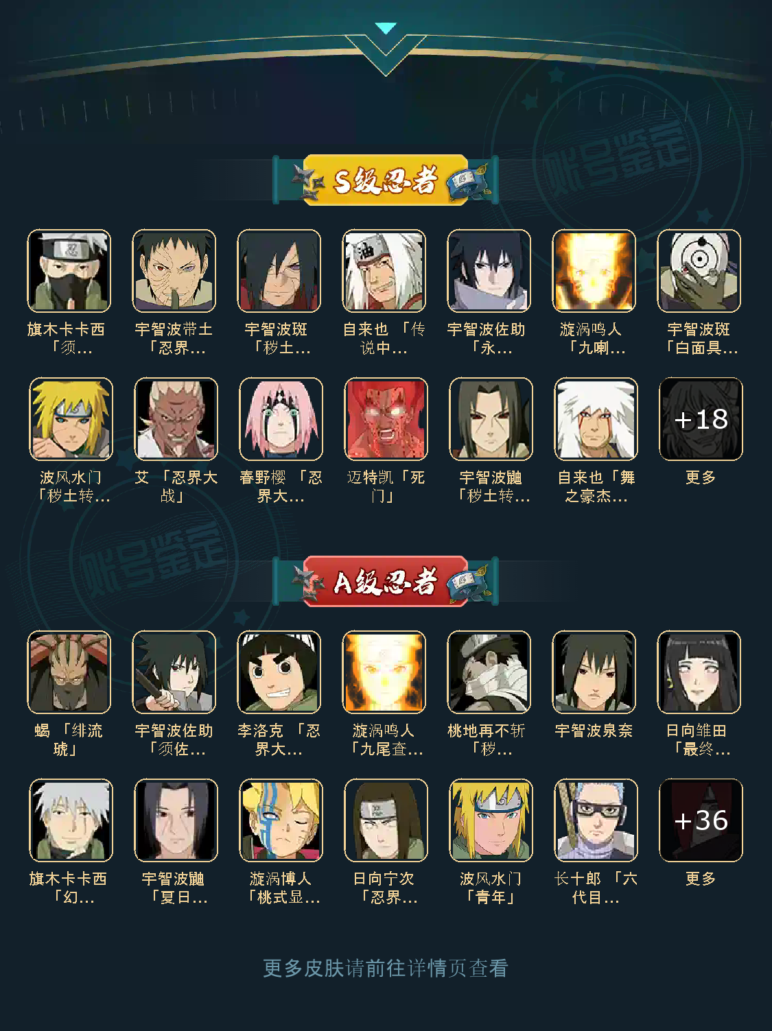 战力:1306W+;VIP10级;S忍25个;A忍43个,通灵兽19个,S忍:大蛇丸普通纲手波风水门猿飞日斩九喇嘛鸣人永恒万花筒佐助忍战樱百豪纲手普通自来也豪杰自来也死门凯秽土水门千手扉间秽土扉间千手柱间秽土斑秽土解斑秽土鼬神秘面具男白面具