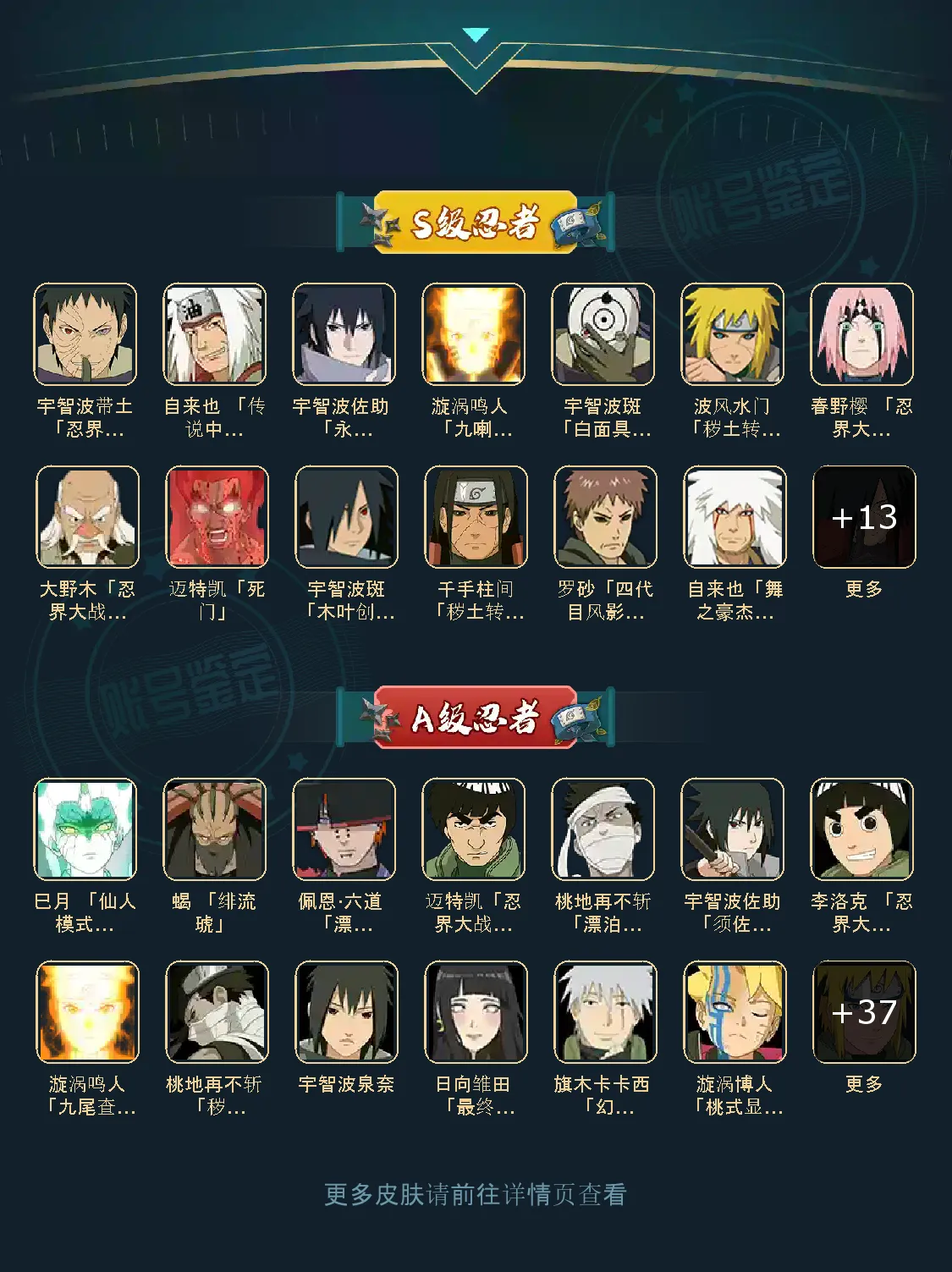 战力:974W+;VIP13级;S忍22个;A忍38个,通灵兽20个,S忍:普通纲手猿飞日斩九喇嘛鸣人忍战樱仙人自来也大蛇丸百豪纲手死门凯波风水门秽土水门秽土扉间秽土柱间秽土斑木叶创立斑白面具忍战带土罗砂金角银角二代土影无秽土半藏忍战大野木