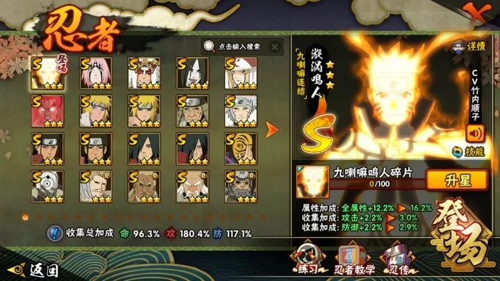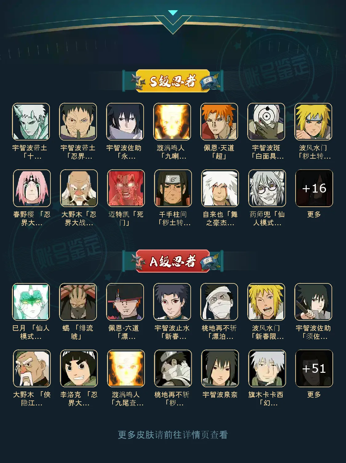 战力:947W+;VIP14级;S忍23个;A忍54个,通灵兽17个,S忍:九喇嘛鸣人忍战樱豪杰自来也大蛇丸百豪纲手死门凯波风水门秽土水门秽土猿飞千手扉间千手柱间秽土柱间宇智波斑秽土斑神秘面具男白面具鬼灯幻月三代艾忍战大野木秽土半藏天道超秽