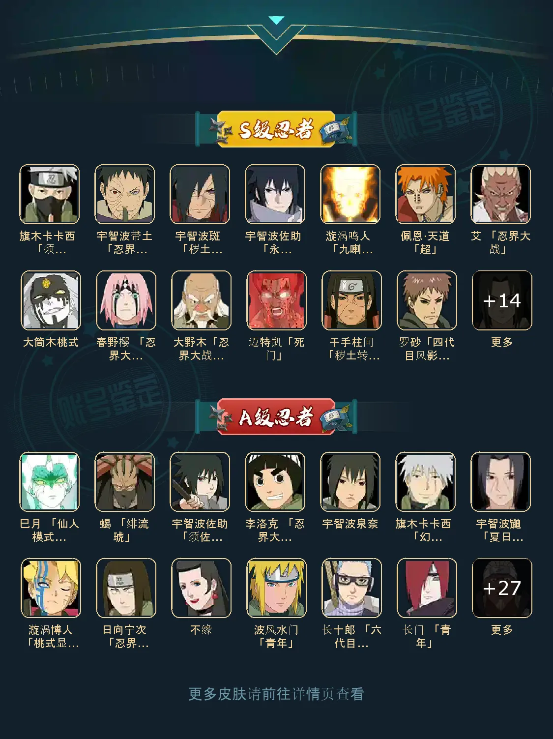 战力:1547W+;VIP10级;S忍22个;A忍29个,通灵兽19个,S忍:普通纲手猿飞日斩九喇嘛鸣人永恒万花筒佐助忍战樱仙人自来也大蛇丸死门凯普通自来也豪杰自来也波风水门秽土猿飞秽土柱间秽土斑秽土解斑秽土鼬忍战带土罗砂忍战大野木天道超仙