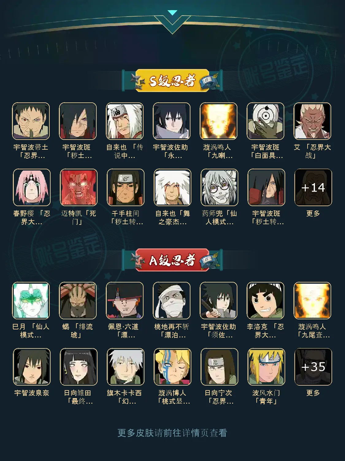 战力:1256W+;VIP10级;S忍27个;A忍48个,通灵兽18个,S忍:普通纲手九喇嘛鸣人永恒万花筒佐助忍战樱普通自来也大蛇丸百豪纲手死门凯波风水门豪杰自来也猿飞日斩秽土猿飞秽土扉间秽土柱间秽土斑秽土解斑白面具忍战带土三代艾秽土半藏秽