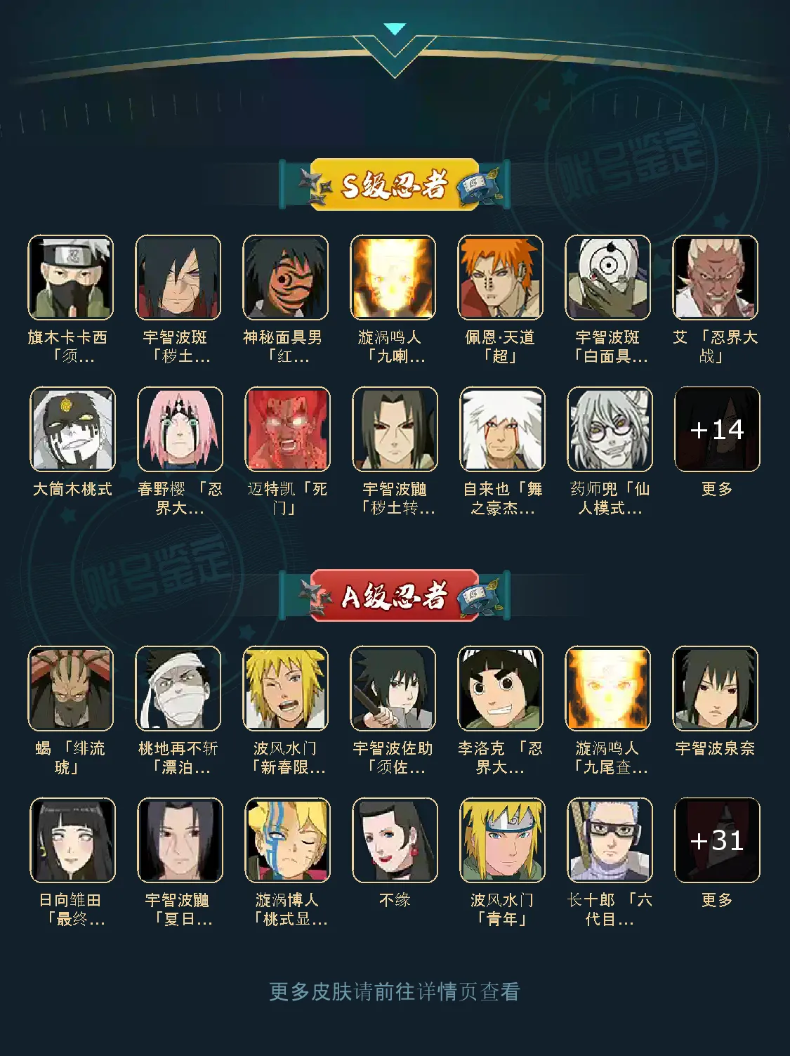 战力:1019W+;VIP13级;S忍23个;A忍35个,通灵兽21个,S忍:普通纲手猿飞日斩九喇嘛鸣人忍战樱仙人自来也大蛇丸死门凯波风水门秽土扉间豪杰自来也秽土斑秽土解斑须佐鼬秽土鼬神秘面具男白面具红夜面具男三代艾秽土半藏二代土影无天道超