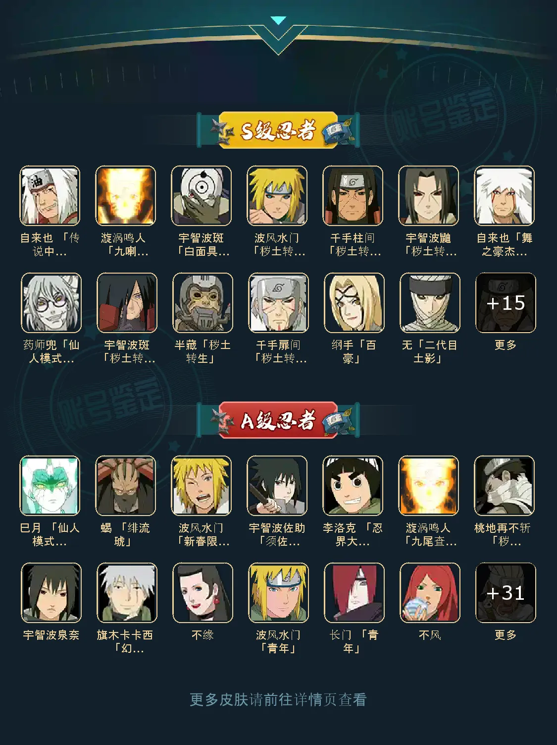战力:1404W+;VIP11级;S忍25个;A忍35个,通灵兽21个,S忍:大蛇丸波风水门普通自来也豪杰自来也百豪纲手普通纲手秽土水门猿飞日斩秽土猿飞秽土扉间千手扉间千手柱间秽土柱间宇智波斑秽土斑须佐鼬秽土鼬神秘面具男白面具四代艾二代土影