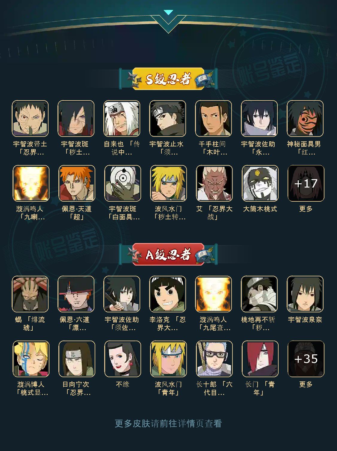 战力:1281W+;VIP12级;S忍30个;A忍41个,通灵兽20个,S忍:九喇嘛鸣人永恒万花筒佐助忍战樱普通自来也豪杰自来也大蛇丸百豪纲手死门凯波风水门秽土水门秽土猿飞秽土扉间木叶创立柱间秽土斑木叶创立斑秽土解斑白面具忍战带土红夜面具男