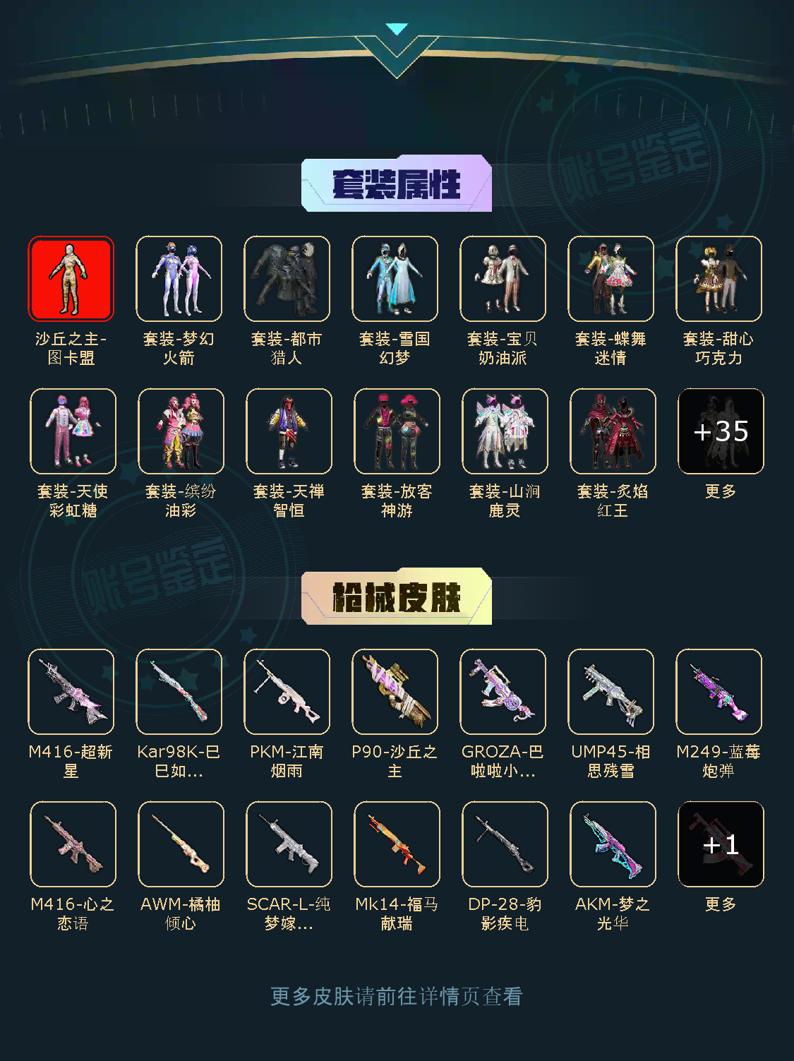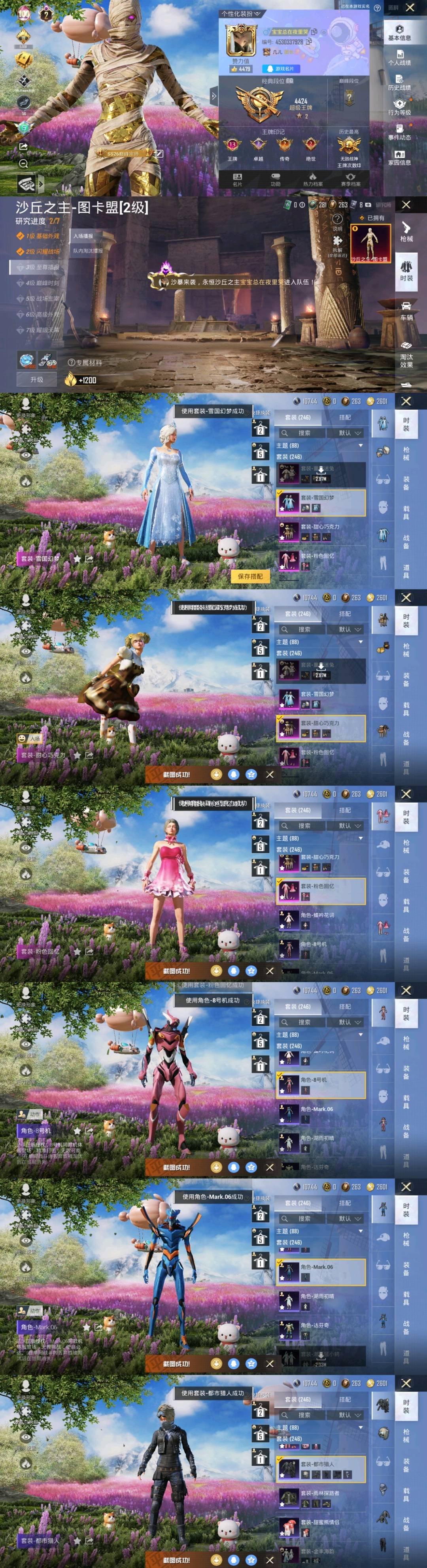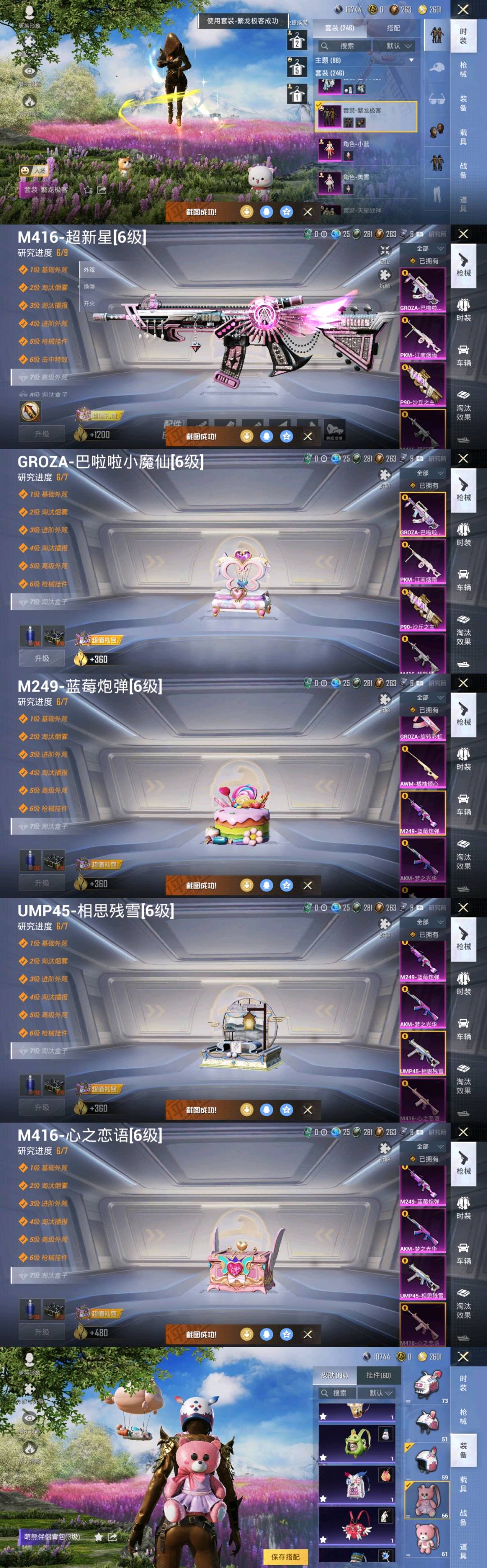 45粉,0载具,246套装,GROZA-旋转彩虹/GROZA-巴啦啦小魔仙/AWM-橘柚倾心/M416-心之恋语/SCAR-L-纯梦嫁纱/PKM-江南烟雨/UMP45-相思残雪/M416-超新星/M249-蓝莓炮弹/P90-沙丘之主/AKM-梦之光华/