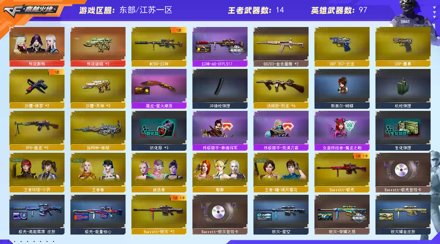 爆破装有 王者星霆(星神)幻神+AG皮肤 极光+皮肤+极光音效卡 裁决 毁灭 QBZ金色蔷薇 USP雷暴+COP 满副武器 满雷