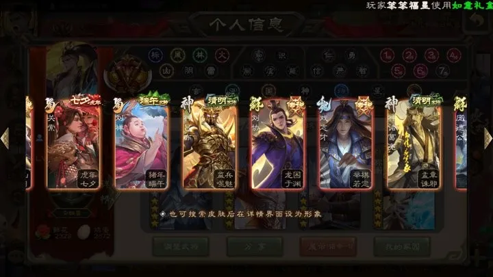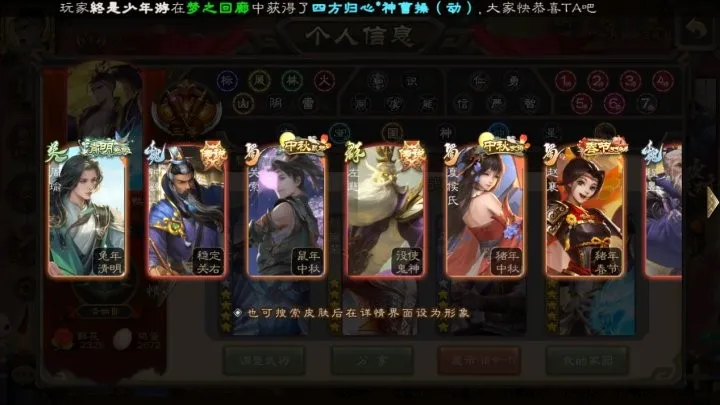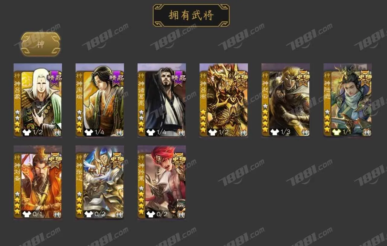 神孙策,神张辽,神刘备,神赵云,神陆逊,神吕布,神吕蒙,神周瑜,神诸葛亮 谋夏侯渊,王粲,界钟会,界曹仁,界曹植,曹昂,戏志才 甘夫人,谋赵云,谋张飞,花鬘 界朱桓,桥公,谋吕蒙,吴景,界朱然,界徐盛,步骘 谋高顺,鲍信,谋刘赪,星黄忠,孔融,刘璋,羊祜,南华老仙,界李儒,董承,界公孙瓒,星张辽,界高顺,张让,麹义 大将军 举棋若定·戏志才,灵魂歌王·留赞,击鼓骂曹·祢衡,超脱于世·庞德公,绽焰摧枯·神陆逊