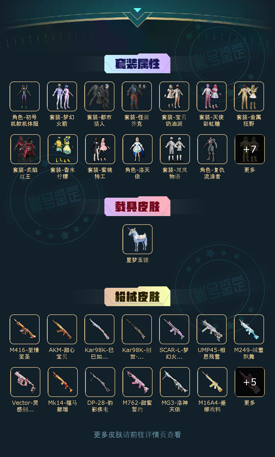 18粉,1载具,160套装,AKM-甜心宝贝/SCAR-L-梦幻火箭/P90-甜蜜草莓/GROZA-香水柠檬/Kar98K-创世·救赎/M416-心之恋语/M16A4-垂柳戏鸭/Vector-灵感创作师/MG3-洛神天依/Vector-环太平洋/M416-至情至圣/AKM-星际浪客/M249-绒雪飘舞/M762-甜蜜誓约/UMP45-相思残雪/星梦玉骢/