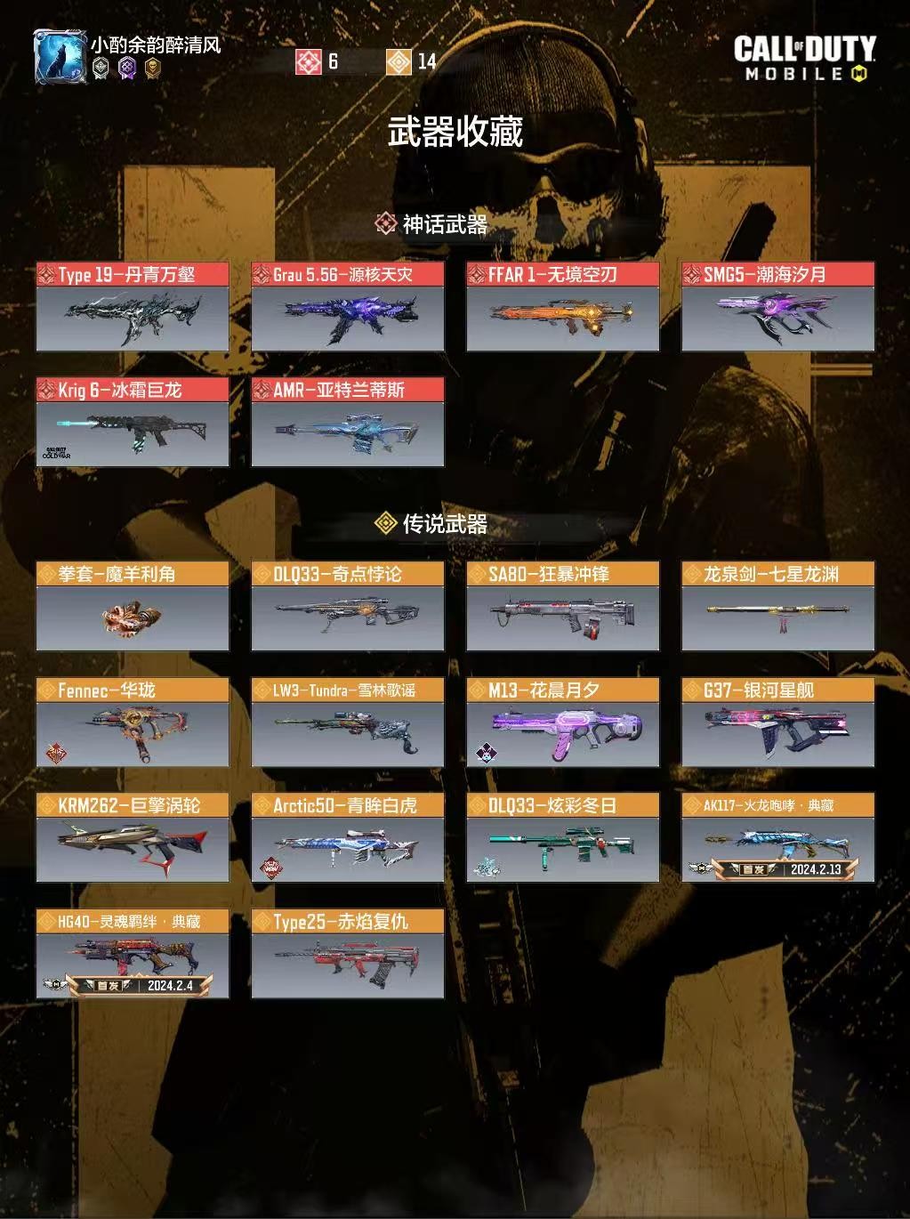 6神6满级神话15橙 丹青万壑+雪林歌谣+巨擘涡轮+冰霜巨龙+亚特兰蒂斯+圣诞狙 源核天灾 无境空刃 潮海汐月 奇点悖论 龙泉剑