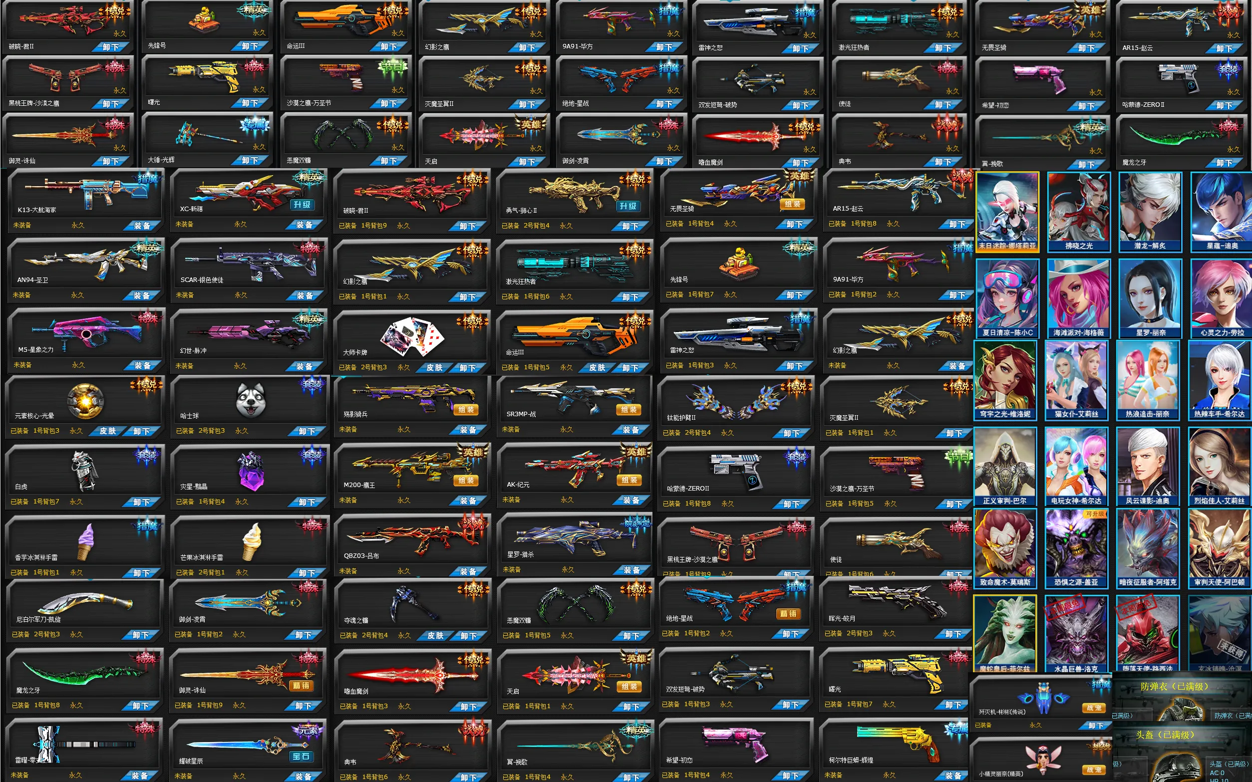 破晓君狮心幻影之鹰激光狂热者,大师卡牌命运赵云先锋号飞行套雷神之怒逆鳞金甲,2017怀旧吕布幻世星罗猎杀银色使徒,护臂灭魔圣翼绝地星战曙光初恋,夺魂之镰嗜血魔剑恶魔双镰,典韦翼挽歌光晕女亚瑟超级玩家,维洛妮热浪追击丽奈,头盔护甲全满,小丑阿巴顿。