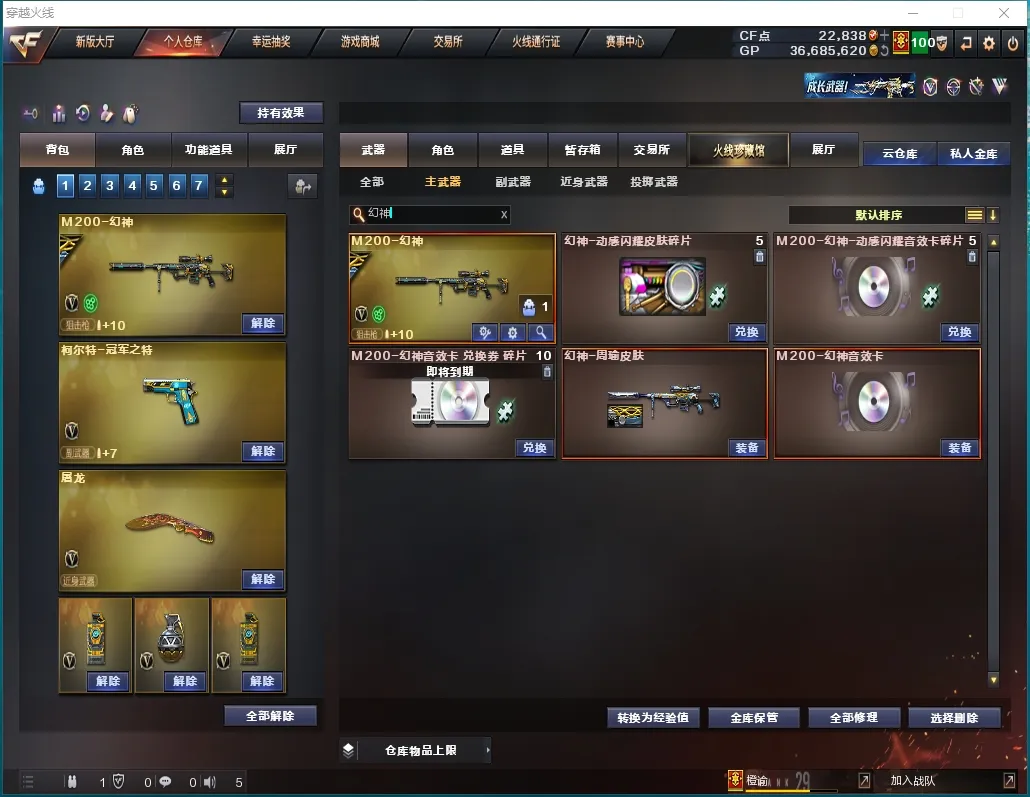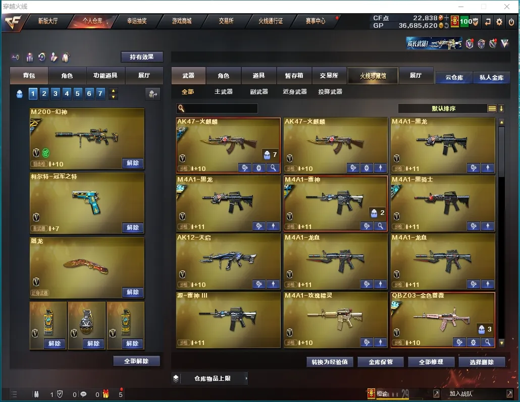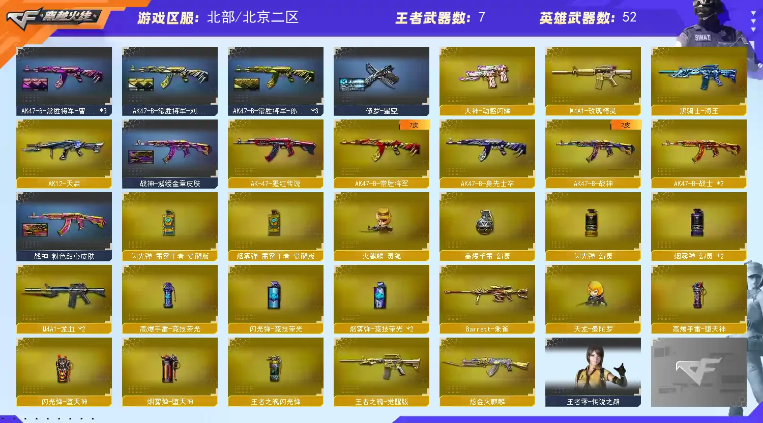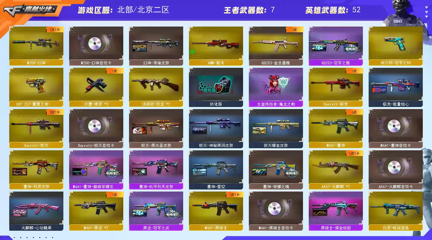 本游戏账号:英雄武器53个; 王者武器8个。 装备不多,但是主武器、副武器、近身武器够用 拥有完美游戏体验。重要的是,特殊装备有:幻灵之锋、麒麟刺-堕天神、烟雾弹-堕天神、闪光弹-堕天神、M200-幻神、M4A1-黑骑士、AK47-火麒麟、黑骑士-海王、烟雾弹-竞技荣光、闪光弹-竞技荣光、M4A1-黑龙、Barrett-毁灭、擎天-竞技荣光、高爆手雷-竞技荣光、M4A1-雷神、Barrett-朱雀、M4A1-玫瑰精灵、QBZ03-金色蔷薇、炫金火麒麟、王者之魄闪光弹、王者之魄-觉醒版、COP 357-雷霆王者-觉醒版、炽天使、职业选手、圣诞潘多拉-X、堕天使、M200-幻神音效卡、Barrett-毁灭音效卡、M4A1-雷神音效卡、AK47-火麒麟音效卡、M4A1-黑骑士音效卡、等,随意畅选。