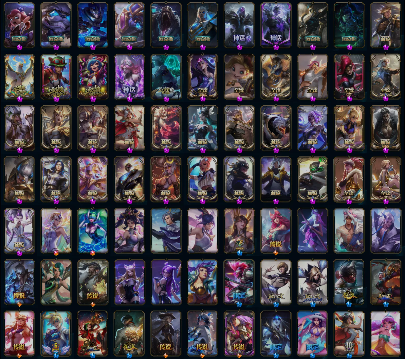 【传说皮肤】黯黑魔龙希瓦娜 暗星锤石 暗星尊烬 奥德赛凯隐 霸天零式赛恩 霸天异形卡兹克 冰川巨兽墨菲特 冰霜亚龙希瓦娜 冰霜之刃艾瑞莉娅 苍穹之光韦鲁斯 大天使长米迦勒凯尔 第三类接触黑默丁格 地狱行者孙悟空 地狱之门卫士加里奥 恶魔男爵瑞兹 恶魔之刃泰达米尔 符文战熊沃利贝尔 钢铁军团盖伦 灌篮高手德莱厄斯 鬼魂新娘莫甘娜 合金巨兽努努和威朗普 红色男爵库奇 金牌主播德莱文 绝息圣堂锐雯 炼狱魔犬内瑟斯 烈焰雄心崔丝塔娜 黎明使者锐雯 黎明使者永恩 灵魂莲华阿狸 陆地王者4WD布里茨 律政大亨蒙多 魔幻卡牌崔斯特 魔女娜美 女帝卡特琳娜 女皇艾希 女警狙击凯特琳 女校长菲奥娜 女主播迦娜 欧米伽小队幽灵特工 偶像歌手阿狸 苹果机器人布里茨 蔷薇绅士杰斯 青花瓷伊泽瑞尔 丧尸布兰德 神龙尊者圣龙李青 神龙尊者昼日真龙亚索 神拳李青 绅士科加斯 神王盖伦 双重冰晶艾尼维亚 死亡骑士盖伦 天煞劫 铁哥们儿奥拉夫 提莫约德尔人的一大步 屠龙勇士潘森 未来战士凯特琳 西部魔影卢锡安 西部天使艾希 西部天使赛娜 邪鸦魅影乐芙兰 腥红之月鬼武姬阿卡丽 星之守护者阿狸 星之守护者金克丝 星之守护者洛 星之守护者霞 血石领主弗拉基米尔 驯龙学者黑默丁格 焰尾妖狐阿狸 耀星女神拉克丝 银河魔装机神兰博 泳池派对吉格斯 源计划超体莫德凯撒 源计划净化薇恩 源计划联合艾希 源计划林易 源计划泯灭雷克顿 约德尔国队长提莫 宇航员诺提勒斯 战场女武神凯尔 战地机甲厄加特 战斗学院凯特琳 真实伤害艾克 至尊魔女莫甘娜 最终BOSS维迦