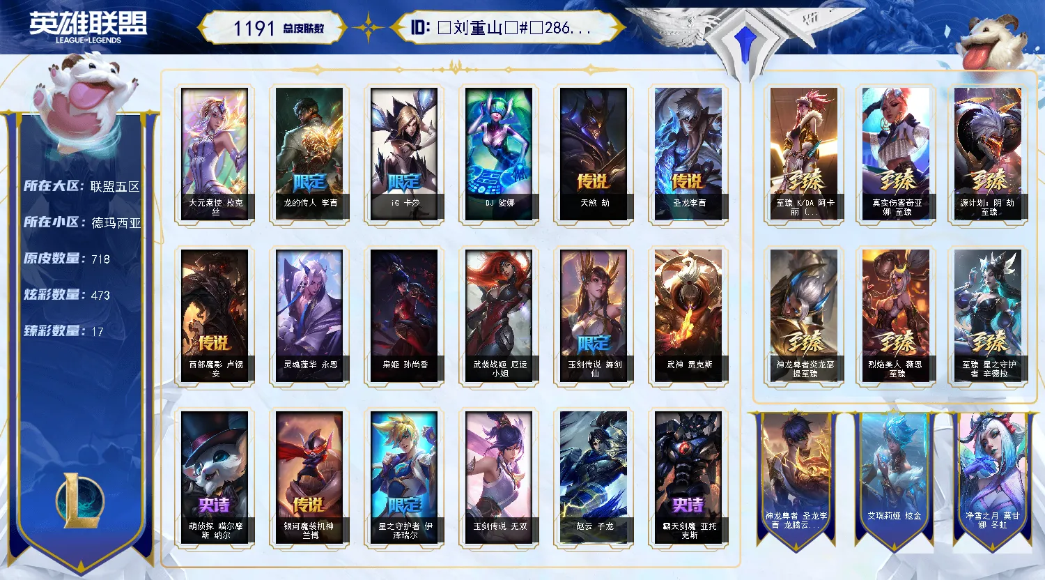 【重要皮肤】黑色玫瑰假面舞会卡特琳娜至臻 双城之战2指挥官凯特琳至臻 狼神英灵斯维因至臻 暗星女王黛安娜至臻 星之守护者辛德拉至臻 月蚀骑士赛娜至臻 神凰行者烈羽焰凰霞至臻 女帝黛安娜至臻 战斗学院蕾欧娜至臻 太空律动璐璐至臻 魔女乐芙兰至臻 奥术师佐伊至臻 真实伤害亚索至臻 真实伤害赛娜至臻 灵能特工伊泽瑞尔至臻 福牛守护者菲奥娜至臻 源计划逆流塞拉斯至臻 源计划阴劫至臻 神龙尊者炎龙瑟提至臻 黑夜使者凯隐至臻 神龙尊者均衡之龙沃利贝尔至臻 征服者贾克斯至臻 飞升战神潘森至臻 KDA二代卡莎至臻 KDA伊芙琳至臻 KDA伊芙琳2022至臻 KDA阿卡丽至臻 KDA阿卡丽2022至臻 烈焰美人薇恩至臻 烈焰美人薇恩2022至臻 魅惑女巫厄运小姐至臻 真实伤害奇亚娜至臻 未来战士锤石至臻 未来战士锤石2022至臻 灰烬守护者慎 灰烬骑士派克 海克斯科技安妮 海克斯科技雷克顿 海克斯科技克格莫 海克斯科技斯维因 海克斯科技吉格斯 海克斯科技嘉文四世 水晶圣骑蕾欧娜 零之枪骑赫卡里姆 摄魂使者薇恩 胜利剑圣易 胜利女神娑娜 胜利之王泰达米尔 胜利巨口克格莫 庆典女皇艾尼维亚 电玩女神阿狸 星之守护者伊泽瑞尔 玉剑传说舞剑仙 神凰行者烈羽焰凰霞 玉剑传说无劫 龙的传人李青 银龙裁决泰隆 替父从军花木兰 神龙烈焰金克丝 南天之怒沃里克 玉净夜叉凯特琳 虎痴之拳蔚 金猪烈焰瑟庄妮 福牛守护者德莱厄斯 胜利女神奥莉安娜 胜利枪神格雷福斯 胜利枪神卢锡安 胜利之剑亚托克斯 碎心之拳蔚 甜心宝贝安妮 觅心魔灵奥莉安娜 冬季仙境奥莉安娜 圣诞老人布隆 持胡萝卜的雪人易 魄罗骑士瑟庄妮 夺命美人卡特琳娜 平安夜女神娑娜 魅惑女巫迦娜 大魔王提莫 泳池派对凯特琳 泳池派对厄运小姐 泳池派对李青 泳池派对蕾欧娜 泳池派对布隆 电玩战魂赫卡里姆 御星魔矢艾希 克格汪 FPX薇恩 iG卡蜜尔 iG洛 iG卡莎 SKTT1辛德拉 SKTT1娜美 SKTT1奥拉夫 SKTT1阿利斯塔 SKTT1卡莉丝塔 SSW锤石 SSW泰隆 SKTT1李青 SKTT1薇恩 暗杀星奥莉安娜 暗杀星蒙多 暗杀星慎 Fnatic迦娜 Fnatic库奇 Fnatic古拉加斯 冰雪节辛吉德 冰雪兽纳尔 防暴士兵辛吉德 冠军典狱长锤石 鬼影森森茂凯 鬼影重重魔腾 海贼瑞兹 胡桃夹子萨科 警用试作体K9内瑟斯 蒙多蒙多 南瓜头费德提克 圣诞精灵崔丝塔娜 圣诞开心鬼提莫 圣诞玩偶波比 圣诞驯鹿克格莫 无头骑士赫卡里姆 邪恶圣诞老人维迦 幸福女神乐芙兰 雪默丁格 雪装奈德丽 野兽猎人瑟庄妮 野兽猎人泰达米尔 勇者奈德丽 征服者诺提勒斯 征服者韦鲁斯 暗影沃里克 冠军之箭艾希 阿木木主人不要我了 2021全球总决赛嘉文四世 地底世界崔斯特 都铎王朝图奇 十五周年纪念希维尔 十周年纪念安妮 源代码乐芙兰 神凰行者瑞羽圣凰艾尼维亚 胜利凤凰艾尼维亚 DJ娑娜 大元素使拉克丝 灵魂守卫乌迪尔 武装战姬厄运小姐 魔女娜美