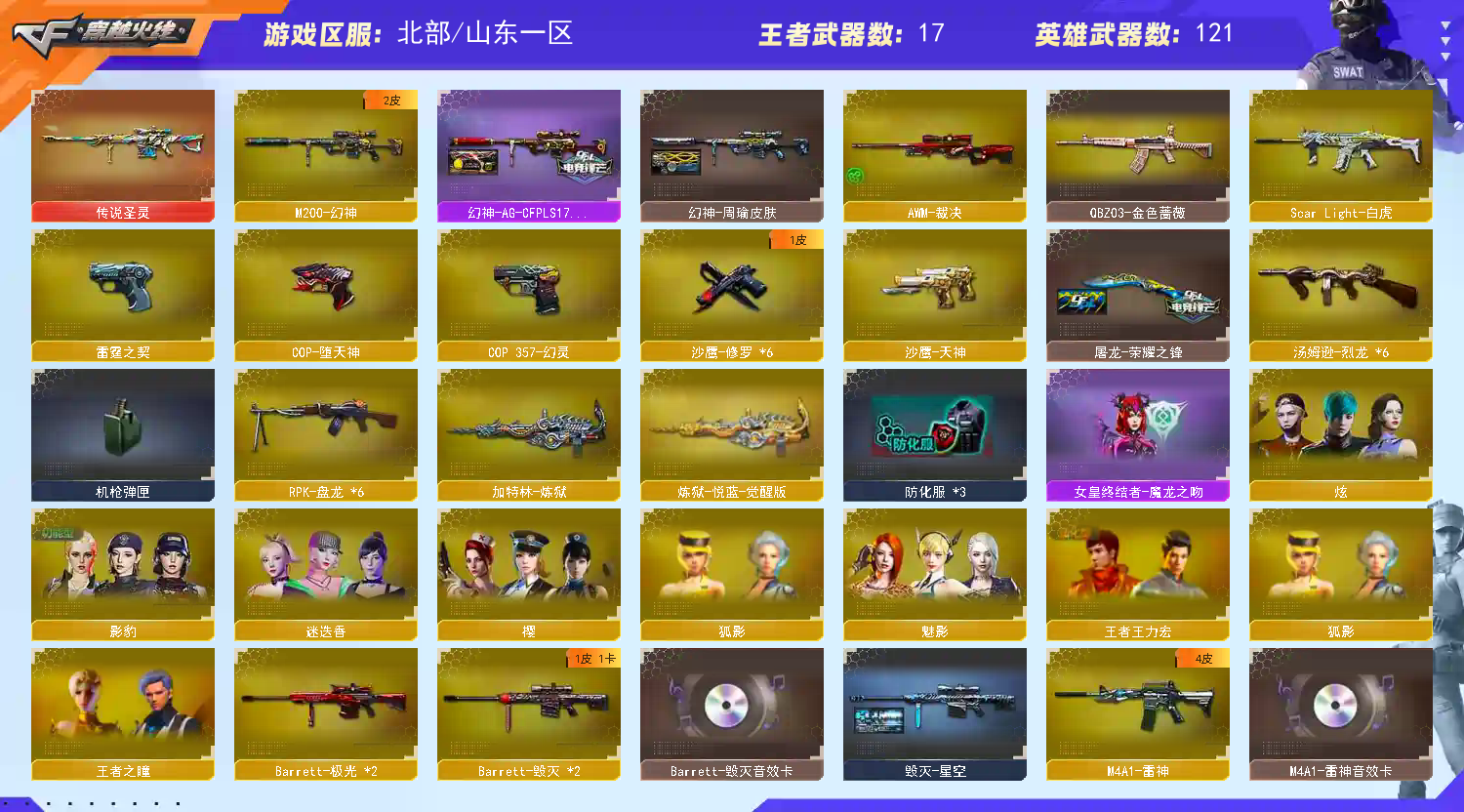 【英雄武器】_M200-幻神/王者幻神-觉醒版/Barrett-毁灭(2)/Barrett-极光(2)/barrett-金色蔷薇/雷霆之怒/王者之怒-觉醒版/AWM-天龙(2)/AWM-裁决/M4A1-雷神/M4A1-死神(5)/M4A1-黑龙/M4A1-千变/M4A1-黑骑士/黑骑士-海王(2)/M4A1-雷霆/M4A1-猎神/M4A1-玫瑰精灵/_Scar Light-白虎/AK12-天启/AK47-火麒麟(2)/AK-47-猩红传说/AK47-机械迷城/AN94-超新星(2)/QBZ03-金色蔷薇/QBZ-03-王者蔷薇-觉醒版/RPK-盘龙(6)/汤姆逊-烈龙(6)/加特林-炼狱/炼狱-悦蓝-觉醒版/COP-堕天神/COP 357-幻灵/雷霆之契/沙鹰-天神/沙鹰-修罗(6)/麒麟刺(5)/麒麟刺-堕天神/龙啸-堕天神/擎天/屠龙(3)/雷霆之锋/幻灵之锋/王者之锋-觉醒版(2)/高爆手雷-幻灵(5)/高爆手雷-雷霆(7)/高爆手雷-堕天神(5)/烟雾弹-幻灵(5)/烟雾弹-雷霆(7)/烟雾弹-堕天神(5)/闪光弹-幻灵(5)/闪光弹-雷霆(7)/闪光弹-堕天神(5)