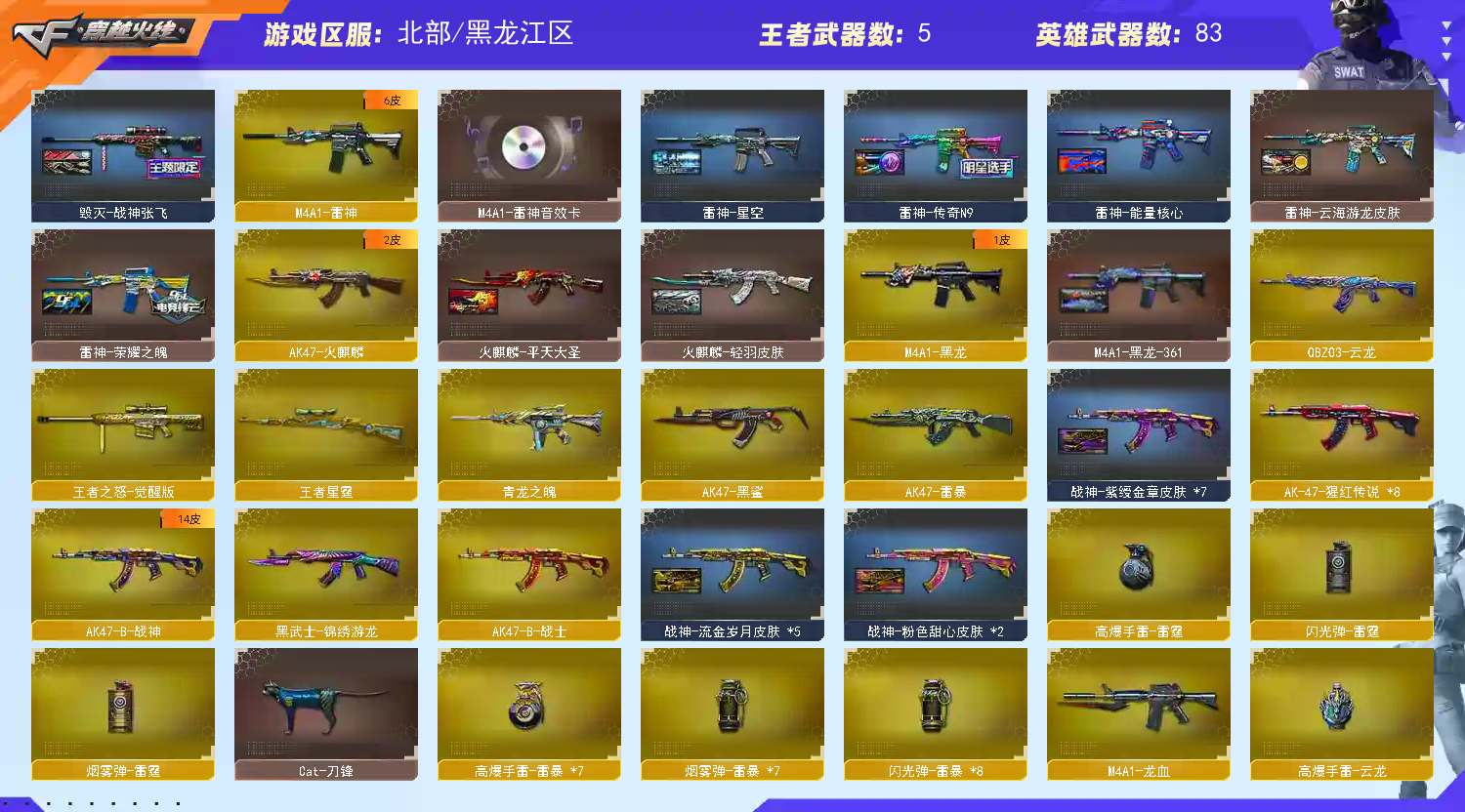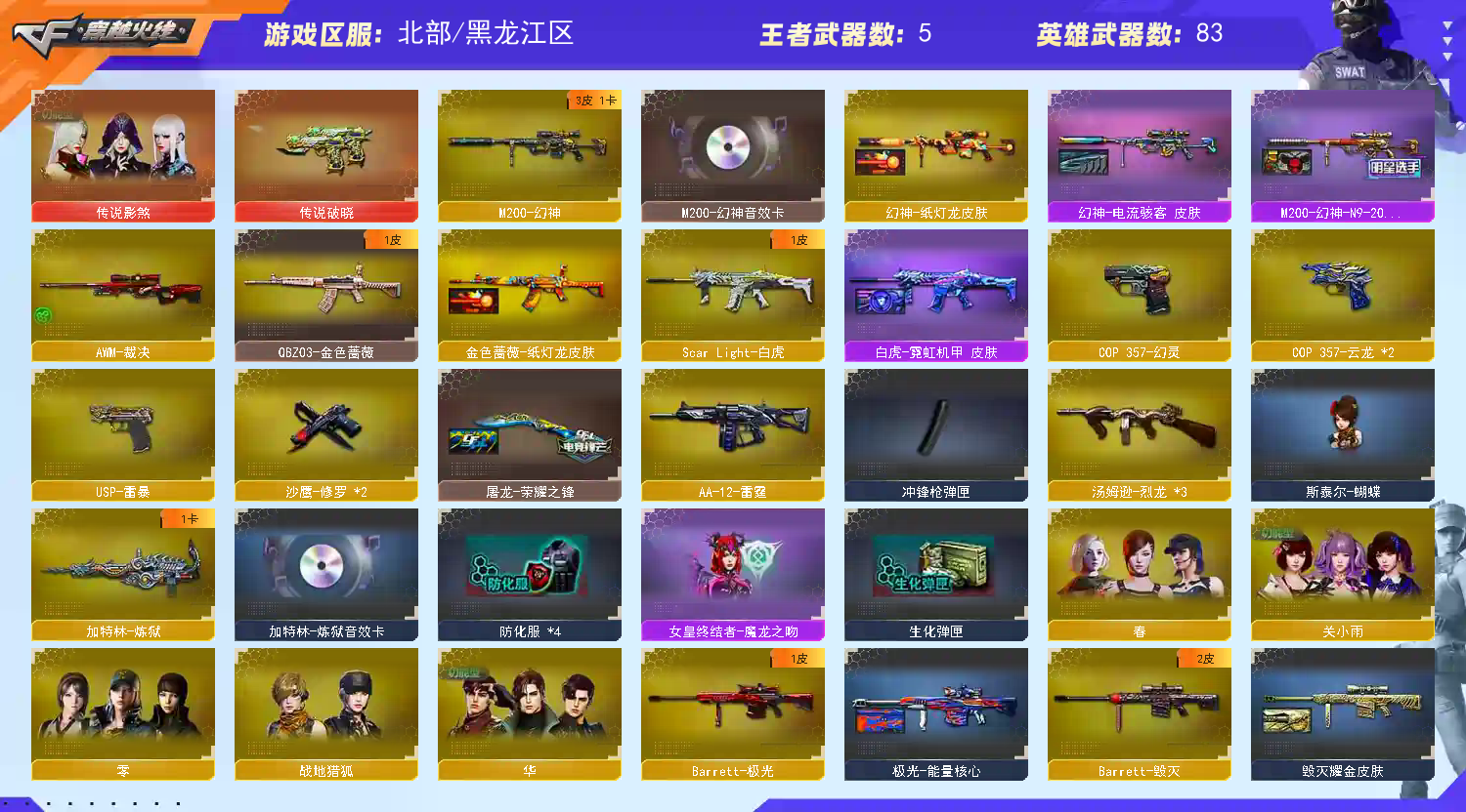 【英雄武器】_M200-幻神/Barrett-毁灭/Barrett-极光/王者之怒-觉醒版/王者之光-觉醒版/AWM-裁决/M4A1-雷神/M4A1-黑龙/M4A1-龙血/王者之势-觉醒版/_Scar Light-白虎/AK47-火麒麟/AK47-雷暴/AK47-黑鲨/AK-47-猩红传说(8)/AK47-B-战士/AK47-B-战神/QBZ03-云龙/QBZ03-金色蔷薇/9A91-烈火(2)/汤姆逊-烈龙(3)/AA-12-雷霆/加特林-炼狱/COP 357-云龙(2)/COP 357-幻灵/沙鹰-修罗(2)/USP-雷暴/云龙扇/麒麟刺/屠龙/雷霆之锋/斩神刀-雷暴/炽芒蝶刃(2)/高爆手雷-云龙/高爆手雷-雷暴(7)/高爆手雷-雷霆/烟雾弹-云龙/烟雾弹-雷暴(7)/烟雾弹-雷霆/闪光弹-云龙(2)/闪光弹-雷暴(8)/闪光弹-雷霆/黑武士-锦绣游龙/超新星-热带奇洋/烈龙-云海游龙/龙啸-热带奇洋/擎天-云海游龙/龙啸-烈火龙威/手雷-热带奇洋/手雷-云海游龙