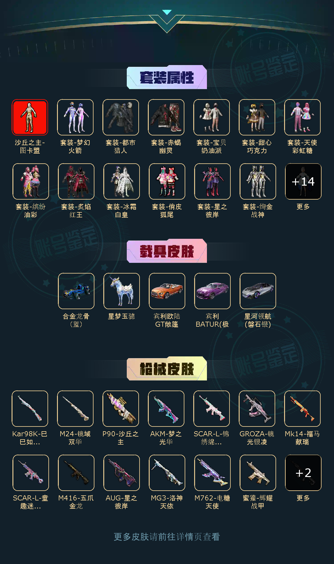【粉色枪皮】M416-五爪金龙/AKM-梦之光华/SCAR-L-锦绣绵绵/SCAR-L-童趣迷兔/M416-墨龙九天/GROZA-镜光银凌/AUG-星之彼岸/M762-电糖天使/蜜獾-辉耀战甲/Kar98K-巳巳如意/M24-镜域双华/P90-沙丘之主/DP-28-千金淑猫/MG3-洛神天依