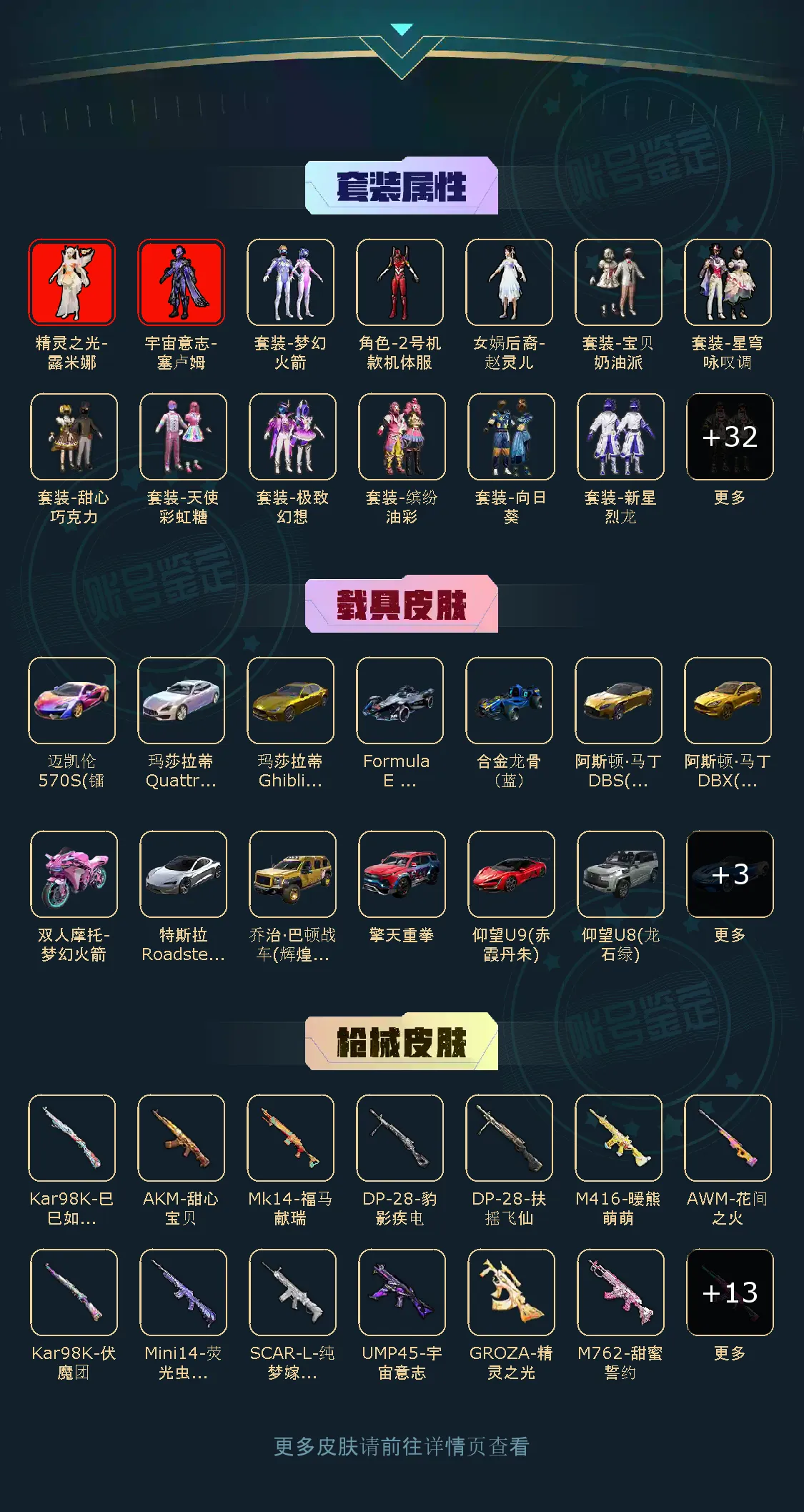 吃了 苹果V-173014热力值 10王牌印记 历史超级王牌10星 230套装 315枪皮 【17载具】 迈凯伦570S镭射紫 (5级) 玛莎拉蒂Q幻星粉 (4级) 乔治巴顿辉煌金 玛莎拉蒂金色 阿斯顿马丁S金色 阿斯顿马丁X金色 仰望U9(赤霞丹朱) 仰望U8(龙石绿) 幽澜尊爵(静谧蓝) 特斯拉R尊享铂 Formula(幽光蓝) 合金龙骨蓝色 擎天重拳 双人摩托梦幻火箭 塞莎深潜蓝 (1级) 鬼马风驰 萌兔起飞僚机 【2神装】 精灵之光-露米娜 宇宙意志-塞卢姆 【2稀有】 奇异狩猎者 AKM-百万伏特 【41粉装】 红螳螂 梦幻火箭 猪猪侠 赵灵儿 宝贝奶油派 天使彩虹糖 甜心巧克力 洛天依 金风玉露 幻影战神 金属狂野 缤纷油彩 放客神游 快乐主宰 数码大师 古堡领主 彗云及圣 狩月元帅 琉璃脉冲 新星烈龙 向日葵 甜蜜誓约 心之恋语 极致幻想 扶摇飞仙 幻彩马卡龙 潮汐统领 灵感创作师 黄蜂伯爵 千面幻镜 鳞翅贤者 星点战士 草莓生巧 诡面斩 香水柠檬 冰霜白皇 炙焰红王 暖熊萌萌 音爆索尼克 海螺星光 蓝莓炮弹 【24特效枪】 SCAR-L-梦幻火箭 (3级) M416-五爪金龙 (1级) SCAR-L-纯梦嫁纱 (1级) M416-心之恋语 (1级) AKM-甜心宝贝 (3级) AKM-炫紫旋律 (1级) UMP45-宇宙意志 (3级) Kar98K-巳巳如意 (5级) Kar98K-伏魔团 (5级) M762-甜蜜誓约 (6级) DP-28-扶摇飞仙 (6级) AWM-花间之火 (5级) Mini14-荧光虫舞 (5级) GROZA-精灵之光 (3级) GROZA-香水柠檬 (3级) AKM-星际浪客 (2级) M762-激战未来 (3级) M416-暖熊萌萌 (1级) 汤姆逊-怪笑疯兔 (3级) 野牛-青空秋雨 (3级) UMP45-启明星 (3级) MK20-H-海螺星光 (2级) M249-蓝莓炮弹 (2级) SKS-碧影闪光 (3级) 【17飞行器】 精灵迷巫飞行器 马卡龙飞行器 伏魔团飞行器 扶摇飞仙飞行器 繁花小夜曲飞行翼 心之恋语飞行翼 至尊龙雀飞行服 梦幻火箭飞行器 荧光虫舞飞行器 童趣迷兔飞行器 四圣焕新飞行器 甜蜜誓约飞行器 古堡领主飞行器 深渊漩涡飞行器 纯梦嫁纱飞行翼 歌者泠鸢飞行器 千面幻镜飞行器 【37热门】 雪山精英 星兔领航员 蔷薇魔法师 暗夜行者 大橘为重 浪漫波比 暗夜契约 怪笑疯兔 诡面顽熊 赛罗奥特曼 团圆交子 瑞龙福将 纯白誓言 忍者信条 酷熊伴侣 冰爽海盐 影双刃 薄荷蓝莓 白虎圣者 朱雀圣者 玄武圣者 青龙圣者 蓝甜马卡龙 粉甜马卡龙 海洋之心 安第斯皇冠 机械英豪 新侠客行 黑色刀锋 军刀雅典娜 M416-快乐主宰 M762-瑞龙福将 M249-古堡领主 Kar98K-古堡领主 Kar98K-PEC最牛战神 M24-香水柠檬 AWM-激战未来 【12头盔】 精灵迷巫头盔 梦幻火箭头盔 火曜朱雀头盔 甜心宝贝头盔 百万伏特头盔 金风玉露头盔 金属狂野头盔 甜蜜誓约头盔 心之恋语头盔 马卡龙头盔 花间之火头盔 夏日绵绵冰头盔 【14背包】 精灵迷巫背包 梦幻火箭背包 火曜朱雀背包 甜心宝贝背包 百万伏特背包 金风玉露背包 金属狂野背包 萌熊伴侣背包 神秘黑猫背包 古堡领主背包 甜蜜誓约背包 心之恋语背包 马卡龙背包 花间之火背包