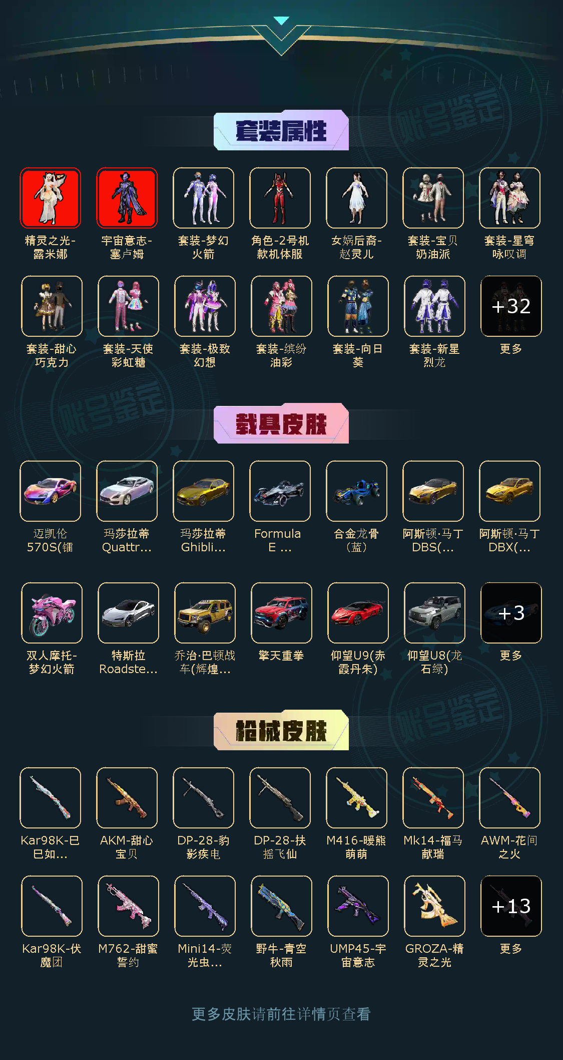 苹果V-173014热力值 10王牌印记 历史超级王牌10星 230套装 315枪皮 【17载具】 迈凯伦570S镭射紫 (5级) 玛莎拉蒂Q幻星粉 (4级) 乔治巴顿辉煌金 玛莎拉蒂金色 阿斯顿马丁S金色 阿斯顿马丁X金色 仰望U9(赤霞丹朱) 仰望U8(龙石绿) 幽澜尊爵(静谧蓝) 特斯拉R尊享铂 Formula(幽光蓝) 合金龙骨蓝色 擎天重拳 双人摩托梦幻火箭 塞莎深潜蓝 (1级) 鬼马风驰 萌兔起飞僚机 【2神装】 精灵之光-露米娜 宇宙意志-塞卢姆 【2稀有】 奇异狩猎者 AKM-百万伏特 【41粉装】 红螳螂 梦幻火箭 猪猪侠 赵灵儿 宝贝奶油派 天使彩虹糖 甜心巧克力 洛天依 金风玉露 幻影战神 金属狂野 缤纷油彩 放客神游 快乐主宰 数码大师 古堡领主 彗云及圣 狩月元帅 琉璃脉冲 新星烈龙 向日葵 甜蜜誓约 心之恋语 极致幻想 扶摇飞仙 幻彩马卡龙 潮汐统领 灵感创作师 黄蜂伯爵 千面幻镜 鳞翅贤者 星点战士 草莓生巧 诡面斩 香水柠檬 冰霜白皇 炙焰红王 暖熊萌萌 音爆索尼克 海螺星光 蓝莓炮弹 【24特效枪】 SCAR-L-梦幻火箭 (3级) M416-五爪金龙 (1级) SCAR-L-纯梦嫁纱 (1级) M416-心之恋语 (1级) AKM-甜心宝贝 (3级) AKM-炫紫旋律 (1级) UMP45-宇宙意志 (3级) Kar98K-巳巳如意 (5级) Kar98K-伏魔团 (5级) M762-甜蜜誓约 (6级) DP-28-扶摇飞仙 (6级) AWM-花间之火 (5级) Mini14-荧光虫舞 (5级) GROZA-精灵之光 (3级) GROZA-香水柠檬 (3级) AKM-星际浪客 (2级) M762-激战未来 (3级) M416-暖熊萌萌 (1级) 汤姆逊-怪笑疯兔 (3级) 野牛-青空秋雨 (3级) UMP45-启明星 (3级) MK20-H-海螺星光 (2级) M249-蓝莓炮弹 (2级) SKS-碧影闪光 (3级) 【17飞行器】 精灵迷巫飞行器 马卡龙飞行器 伏魔团飞行器 扶摇飞仙飞行器 繁花小夜曲飞行翼 心之恋语飞行翼 至尊龙雀飞行服 梦幻火箭飞行器 荧光虫舞飞行器 童趣迷兔飞行器 四圣焕新飞行器 甜蜜誓约飞行器 古堡领主飞行器 深渊漩涡飞行器 纯梦嫁纱飞行翼 歌者泠鸢飞行器 千面幻镜飞行器 【37热门】 雪山精英 星兔领航员 蔷薇魔法师 暗夜行者 大橘为重 浪漫波比 暗夜契约 怪笑疯兔 诡面顽熊 赛罗奥特曼 团圆交子 瑞龙福将 纯白誓言 忍者信条 酷熊伴侣 冰爽海盐 影双刃 薄荷蓝莓 白虎圣者 朱雀圣者 玄武圣者 青龙圣者 蓝甜马卡龙 粉甜马卡龙 海洋之心 安第斯皇冠 机械英豪 新侠客行 黑色刀锋 军刀雅典娜 M416-快乐主宰 M762-瑞龙福将 M249-古堡领主 Kar98K-古堡领主 Kar98K-PEC最牛战神 M24-香水柠檬 AWM-激战未来 【12头盔】 精灵迷巫头盔 梦幻火箭头盔 火曜朱雀头盔 甜心宝贝头盔 百万伏特头盔 金风玉露头盔 金属狂野头盔 甜蜜誓约头盔 心之恋语头盔 马卡龙头盔 花间之火头盔 夏日绵绵冰头盔 【14背包】 精灵迷巫背包 梦幻火箭背包 火曜朱雀背包 甜心宝贝背包 百万伏特背包 金风玉露背包 金属狂野背包 萌熊伴侣背包 神秘黑猫背包 古堡领主背包 甜蜜誓约背包 心之恋语背包 马卡龙背包 花间之火背包