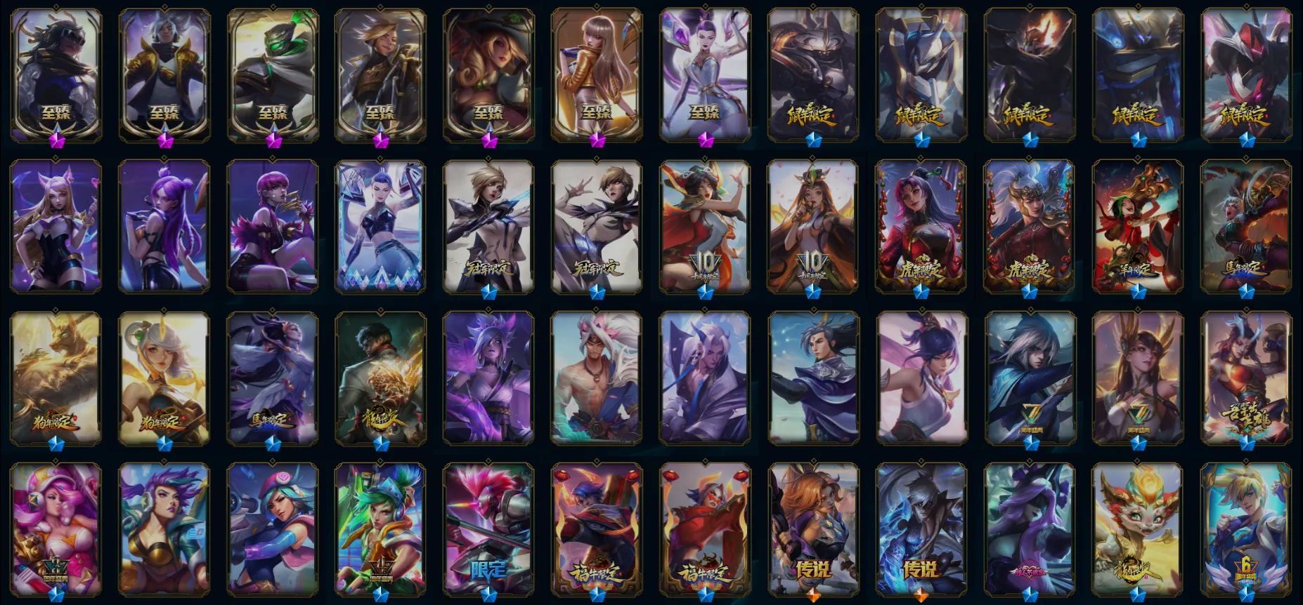【传说皮肤】死亡骑士盖伦 黑夜使者索拉卡 太空律动律动队长提莫 幻灵战斗队长厄运小姐 最终BOSS维迦 苹果机器人布里茨 恶魔之刃泰达米尔 暗星锤石 焰尾妖狐阿狸 提莫约德尔人的一大步 源计划超体莫德凯撒 战场女武神凯尔 源计划林易 女警狙击凯特琳 暗星女王拉克丝 枯萎之壤泽拉斯 宇航员诺提勒斯 源计划泯灭雷克顿 电玩女神娑娜 苍穹之光韦鲁斯 炼狱魔犬内瑟斯 星之守护者金克丝 泳池派对吉格斯 铁哥们儿奥拉夫 钢铁军团盖伦 神龙尊者圣龙李青 星之守护者霞 灌篮高手德莱厄斯 霸天零式赛恩 战斗学院凯特琳 奥德赛凯隐 冰霜亚龙希瓦娜 暗星尊烬 黯晶凤凰艾尼维亚 黑夜使者亚索 西部天使艾希 地狱之门卫士加里奥 合金巨兽努努和威朗普 丧尸布兰德 女皇艾希 黯黑魔龙希瓦娜 约德尔国队长提莫 驯龙学者黑默丁格 大天使长米迦勒凯尔 蔷薇绅士杰斯 真实伤害艾克 西部魔影卢锡安 战斗学院伊泽瑞尔 黎明使者锐雯 未来战士凯特琳 源计划毁灭派克 源计划净化薇恩 星之守护者拉克丝 鬼魂新娘莫甘娜 冰霜之刃艾瑞莉娅 神王盖伦 神王德莱厄斯 第三类接触黑默丁格 魔幻卡牌崔斯特 战地机甲厄加特 恶魔男爵瑞兹 驯龙炮手崔丝塔娜 冰川巨兽墨菲特 源计划联合艾希 战地巨兽科加斯 绅士科加斯 地狱行者孙悟空 陆地王者4WD布里茨 女校长菲奥娜 欧米伽小队幽灵特工 烈焰雄心崔丝塔娜 上古战魂魔腾