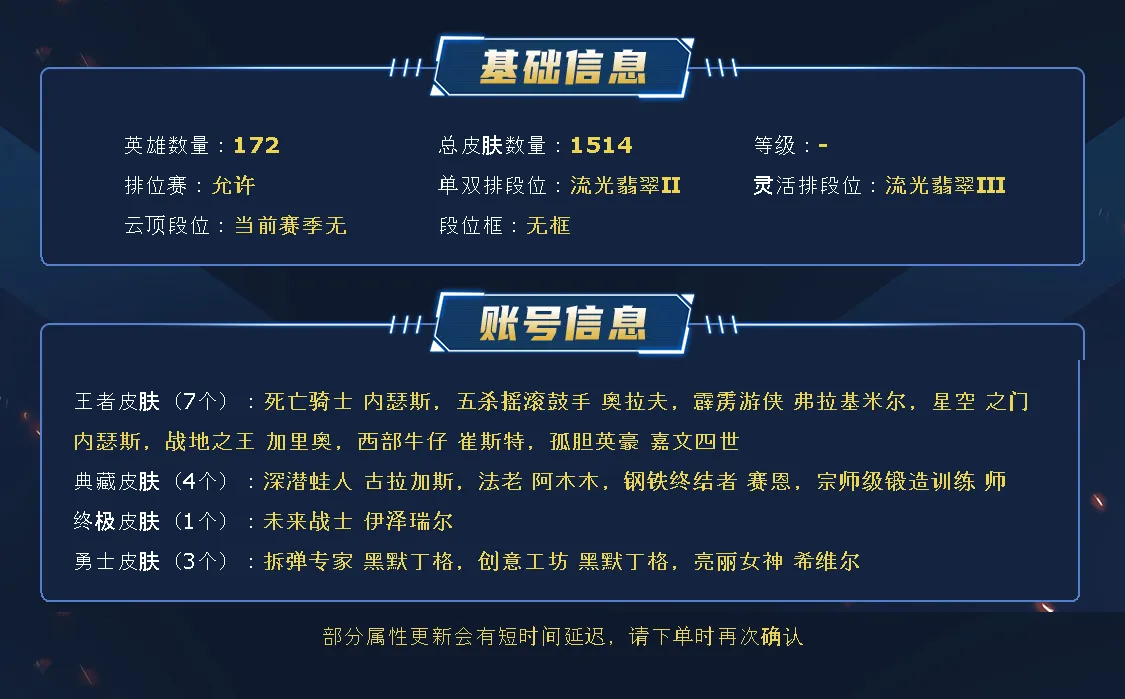 ~~喜欢记得收藏~~可排位~~1434皮全英雄~~租之前尽量查一下游戏ID,确保段位是您需要的,避免浪费您的时间~~请勿挂机逃跑故意送人头,谢谢合作,谢谢~~