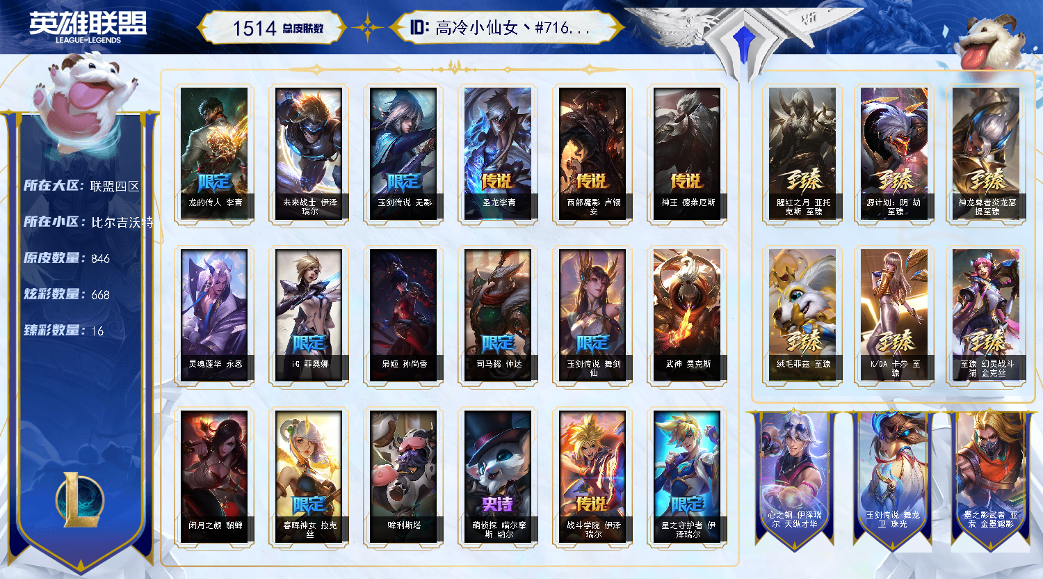 【重要皮肤】天龙之子伊泽瑞尔至臻 心之钢永恩至臻 魔女阿卡丽至臻 斗魂觉醒萨科至臻 幻灵战斗猫金克丝至臻 青花瓷拉克丝至臻 神凰行者烈羽焰凰霞至臻 魅惑女巫莫甘娜至臻 女帝黛安娜至臻 战斗学院蕾欧娜至臻 太空律动璐璐至臻 魔女婕拉至臻 魔女乐芙兰至臻 未来战士卢锡安至臻 真实伤害亚索至臻 真实伤害赛娜至臻 星之守护者索拉卡至臻 灵魂莲华提莫至臻 灵能特工伊泽瑞尔至臻 福牛守护者菲奥娜至臻 源计划逆流塞拉斯至臻 源计划阴劫至臻 王国机神玄武盖伦至臻 暗星墨菲特至臻 神龙尊者炎龙瑟提至臻 黑夜使者凯隐至臻 神龙尊者均衡之龙沃利贝尔至臻 征服者贾克斯至臻 飞升战神潘森至臻 焰执事布兰德至臻 KDA二代卡莎至臻 KDA一代卡莎至臻 源计划正义艾瑞莉娅至臻 绒毛菲兹至臻 绒毛菲兹2022至臻 腥红之月亚托克斯至臻 腥红之月亚托克斯2022至臻 未来战士锤石至臻 未来战士锤石2022至臻 黑夜使者李青至臻 黑夜使者李青2022至臻 海克斯科技瑟庄妮 海克斯科技雷克顿 海克斯科技克格莫 海克斯科技斯维因 海克斯科技吉格斯 海克斯科技玛尔扎哈 海克斯科技波比 海克斯科技魔腾 新卧虎藏龙贾克斯 永恒之森奥恩 暗星科加斯 光明哨兵奥拉夫 黎明使者卡尔玛 摄魂使者薇恩 新创战纪希维尔 胜利女神希维尔 胜利之王泰达米尔 养蜂人辛吉德 电玩女神厄运小姐 电玩勇者锐雯 电玩女神阿狸 星之守护者伊泽瑞尔 玉剑传说无影 玉剑传说舞剑仙 神凰行者幽羽玄凰萨勒芬妮 神凰行者烈羽焰凰霞 玉剑传说舞龙卫 灵能特工易 龙的传人李青 天龙之子斯莫德 虎头虎脑崔丝塔娜 烈焰仙子黛安娜 龙腾虎跃瑟提 猛虎下山赵信 招财进宝提莫 替父从军花木兰 神龙烈焰金克丝 春晖神女拉克丝 你看见过我的熊猫吗安妮 北辰之威内瑟斯 南天之怒沃里克 美猴王孙悟空 玉净夜叉凯特琳 紫金罗刹莫甘娜 广寒仙子嫦娥 虎痴之拳蔚 司马懿仲达 烈焰美人薇恩 征服者贾克斯 王国机神青龙德莱文 王国机神朱雀蕾欧娜 王国机神苍狼瑟提 王国机神白虎贾克斯 王国机神玄武盖伦 福牛守护者安妮 福牛守护者厄斐琉斯 福牛守护者德莱厄斯 福牛守护者阿利斯塔 福牛守护者嘉文四世 福牛守护者菲奥娜 胜利女神瑟庄妮 胜利机器人布里茨 胜利枪神卢锡安 觅心游侠卢锡安 觅心之翼奎因 幽梦玫瑰辛德拉 北极星猎人斯维因 冬境仙灵索拉卡 冬季仙境奥莉安娜 圣诞捣蛋鬼金克丝 冰雪风暴希维尔 持胡萝卜的雪人易 狂心冰王图奇 冰雪女神辛德拉 魄罗骑士瑟庄妮 夺命美人卡特琳娜 平安夜女神娑娜 伯爵卡萨丁 大魔法锅布里茨 大魔王提莫 克烈古拉伯爵 泳池派对普朗克 泳池派对奥莉安娜 泳池派对嘉文四世 泳池派对黑默丁格 泳池派对塔莉垭 泳池派对厄运小姐 泳池派对菲奥娜 泳池派对李青 泳池派对雷克顿 泳池派对瑟提 泳池派对布隆 电玩战魂赫卡里姆 送披萨的小姐姐希维尔 克格汪 DWG凯南 FPX薇恩 iG卡蜜尔 iG菲奥娜 SSG霞 SSG洛 SKTT1扎克 SKTT1烬 SKTT1奥拉夫 SKTT1阿利斯塔 SKTT1卡莉丝塔 SKTT1阿兹尔 SKTT1雷克顿 SSW雷恩加尔 SSW图奇 SSW辛吉德 SKTT1贾克斯 SKTT1婕拉 SKTT1李青 暗杀星奥莉安娜 暗杀星蒙多 暗杀星努努和威朗普 暗杀星伊泽瑞尔 暗杀星慎 Fnatic迦娜 Fnatic库奇 Fnatic古拉加斯 Fnatic嘉文四世 冰雪节格雷福斯 冰雪节辛吉德 防暴士兵辛吉德 防暴天使凯尔 钢铁之翼艾尼维亚 冠军典狱长锤石 冠军之血希瓦娜 冠军之隐劫 冠军之志瑞兹 鬼影森森茂凯 鬼影重重魔腾 红桃杰克崔斯特 警用试作体K9内瑟斯 密林猎手提莫 南瓜头费德提克 女猎手希维尔 破空枪骑孙悟空 圣诞精灵崔丝塔娜 圣诞开心鬼提莫 圣诞狂欢基兰 圣诞狂欢努努和威朗普 圣诞老人古拉加斯 圣诞玩偶波比 圣诞驯鹿克格莫 糖果使徒费德提克 外星装甲库奇 喜庆之树茂凯 邪恶圣诞老人维迦 幸福女神乐芙兰 雪默丁格 野兽猎人德莱文 野兽猎人瑟庄妮 野兽猎人泰达米尔 英勇玩具兵普朗克 征服者阿利斯塔 征服者卡尔玛 征服者诺提勒斯 征服者韦鲁斯 暗影沃里克 诺斯费拉图弗拉基米尔 2021全球总决赛嘉文四世 都铎王朝图奇 十五周年纪念希维尔 十周年纪念安妮 源代码乐芙兰 神凰行者瑞羽圣凰艾尼维亚 胜利凤凰艾尼维亚 未来战士伊泽瑞尔 绝息圣堂洛